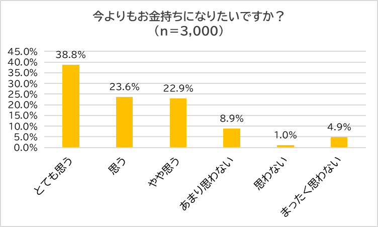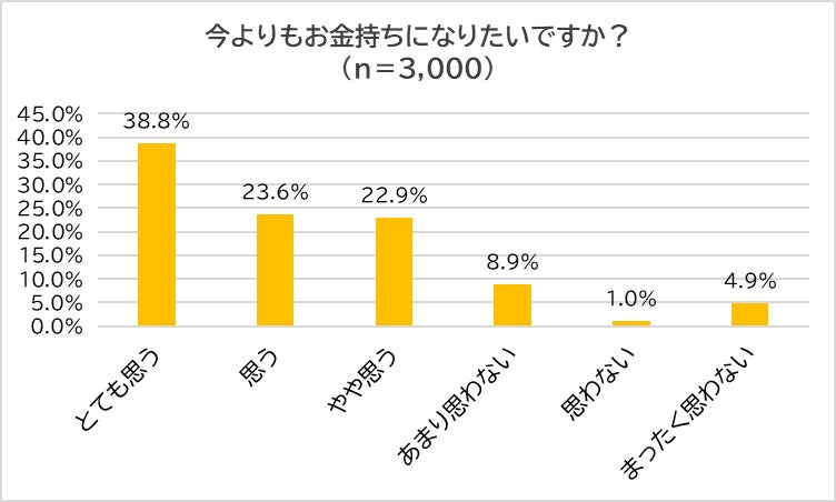 次に、「今よりもお金持ちになりたいか?」尋ねたところ、4割弱(38.8%)が「とても思う」と回答、以下「思う」(23.6%)、「やや思う」(22.9%)となり、9割近く(85.3%)が今よりもお金持ちになりたいと思っていました。