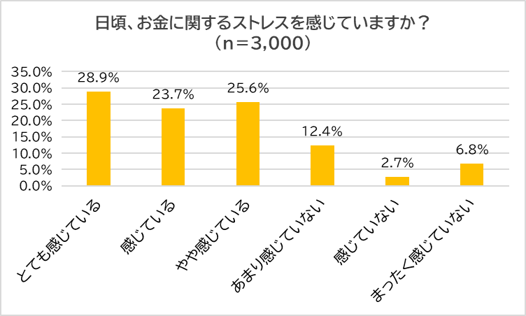 昨年から様々な物価が高騰しています。そこで、「日頃、お金に関するストレスを感じているか?」尋ねたところ、「とても感じている」(28.9%)が最も多く、「やや感じている」(25.6%)、「感じている」(23.7%)と8割弱(78.2%)が日頃からお金のストレスを感じていることがわかりました。