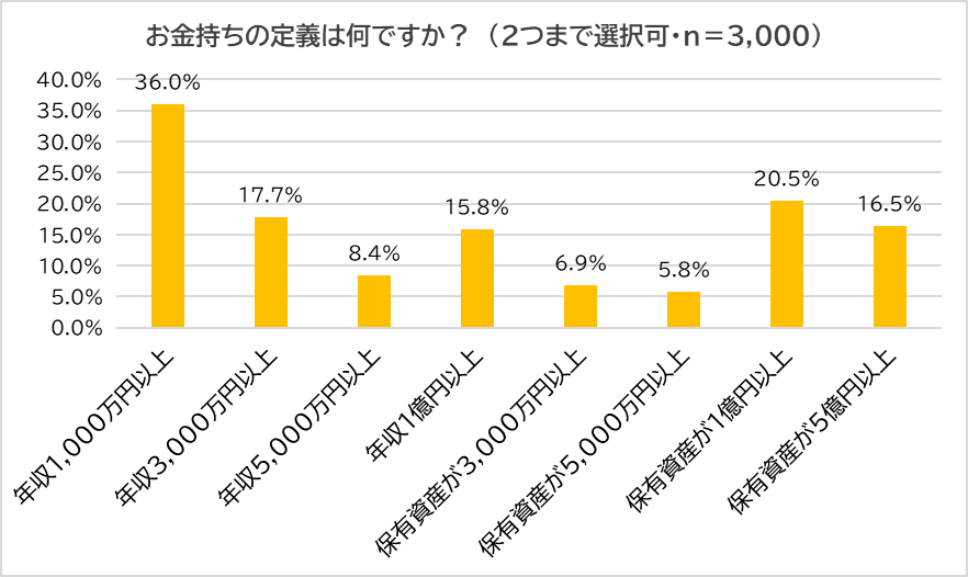 一般的に資産家の定義は、保有資産が1億円以上持っている人と言われています。では、「お金持ちの定義は何なのか?」尋ねました。最も多かったのは「年収1,000万円以上」(36.0%)で、以下「保有資産が1億円以上」(20.5%)、「年収3,000万円以上」(17.7%)、「保有資産が5億円以上」(16.5%)、「年収1億円以上」(15.8%)となり、「年収1,000万円以上」以降はバラつきが目立ちました。