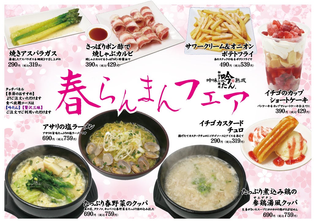 【タッチパネルで注文・配膳ロボットでお届け】の「秘伝タレ焼肉 吟味熟成 吟たん」では3月2日より【春らんまんフェア】を開始いたします。