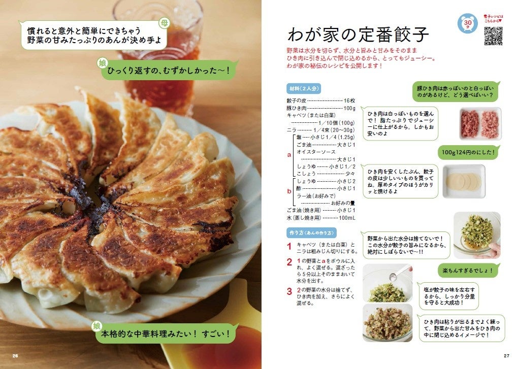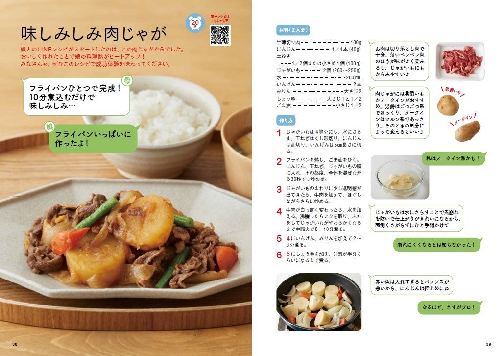 そして、豚のしょうが焼き、肉じゃが、ハンバーグといった定番料理を、母と娘のLINEのやりとりで展開する、いまの時代に合った新しいレシピ本でもあります。