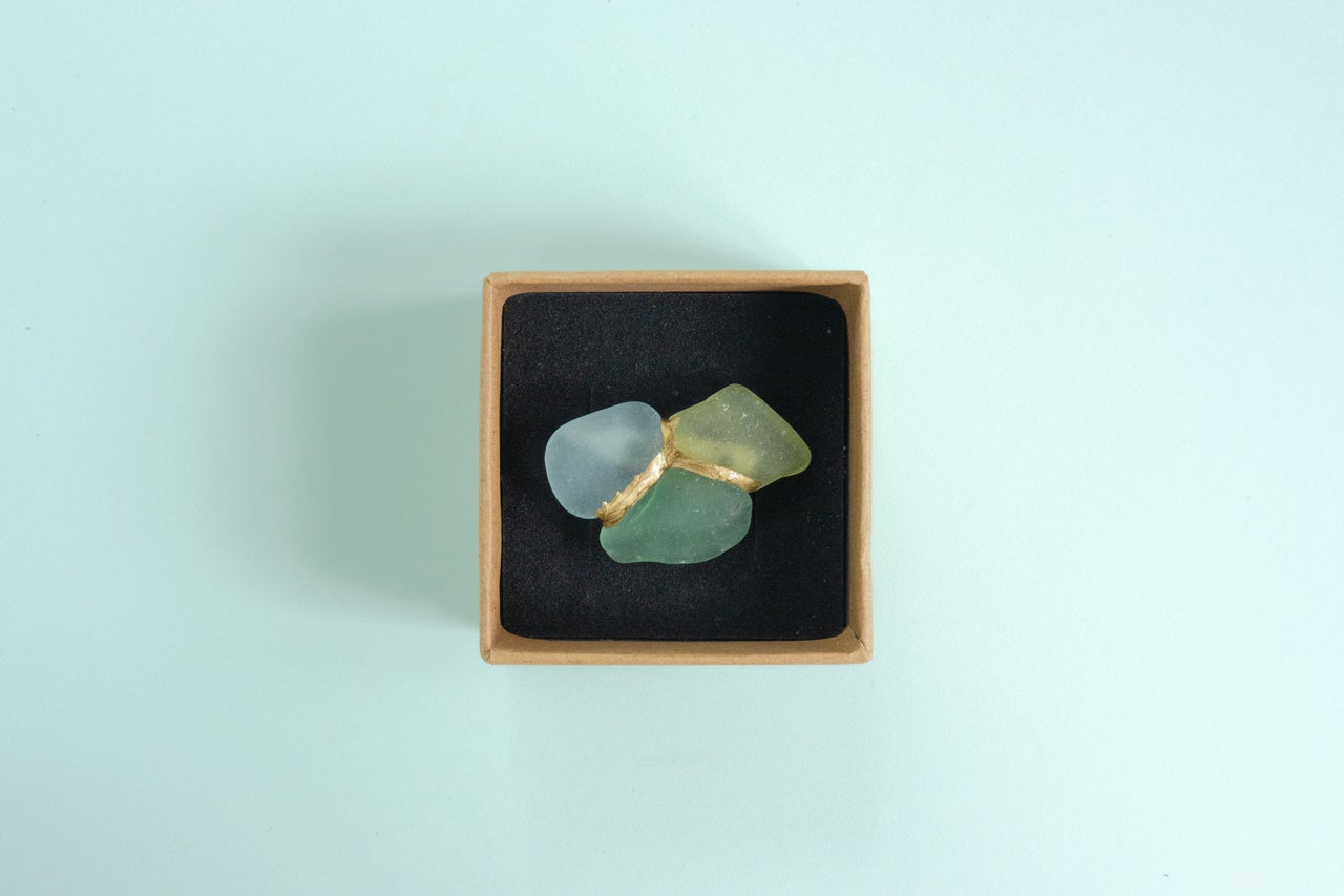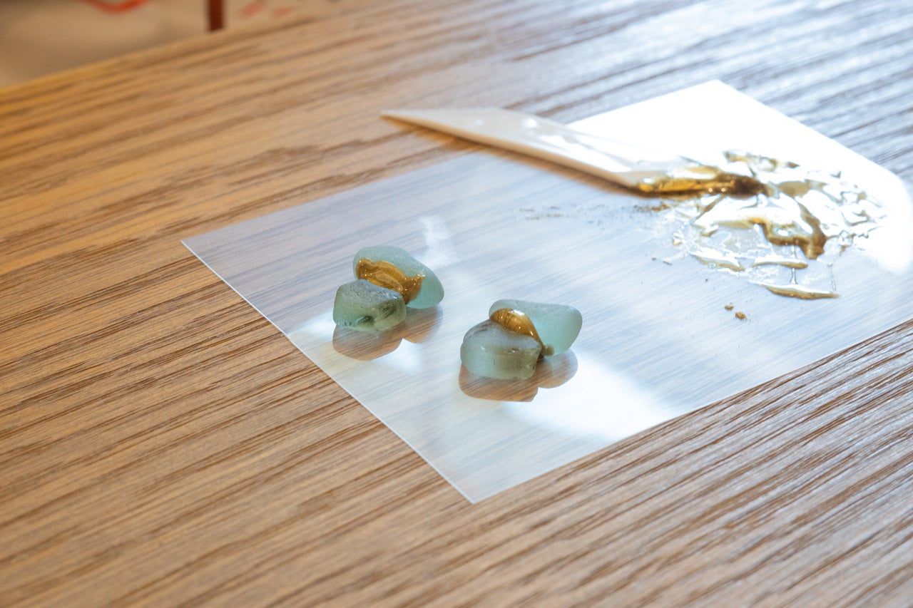 「KISSAKO」のワークショップでは、シーグラスを金継ぎしてアクセサリーを制作します。ブローチ、ピアス、イヤリングの中から好きなタイプを選び、お好みのシーグラスを接着して仕上げ、その日のうちにお持ち帰りいただけます。初めての方でもスタッフが丁寧に指導しますので、どなたでも気軽にご参加ください。