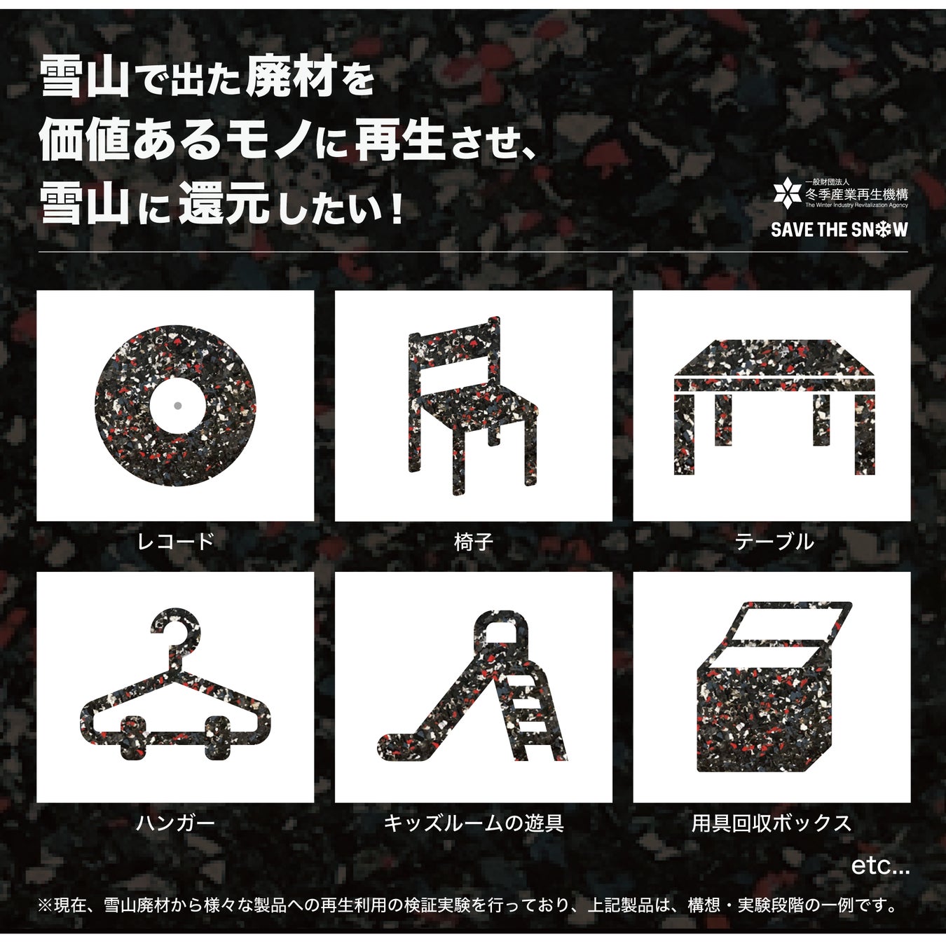 一方、スキー場で貸し出されているブーツやスキー板、スノーボードなどのレンタル用具の需要も高まっており、レンタル用具も耐久性の問題やモデルチェンジの都合により2〜3年スパンで入れ替えが行われます。ブーツなどのレンタル用具やスキー場で使用されているネットやポールなどの機材には多くのプラスチックが使われており、それらのプラスチックは多くが廃棄に回されたり、使われずに放置されてしまったりしています。この課題に対し、冬季産業再生機構では雪資源の保全を目指す"SAVE THE SNOW アクション"として、植樹、絵本やコンサートの語り部活動を経て、新たに雪山から出る廃材を再生させ、価値あるモノを雪山へ還元するアップサイクルの実現にチャレンジすることにしました。