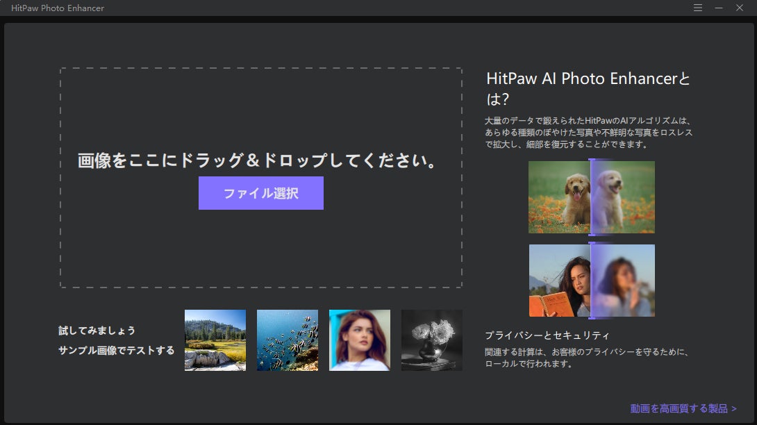 Step1:上記リンクからコンピュータにHitPaw Photo Enhancerを無料でダウンロードします。「画像を選択」をクリックして、補正したい写真をインポートします。