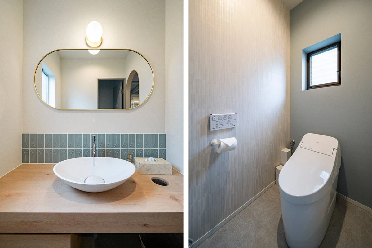 床材はテラゾー風の長尺シートにゴールドの見切り材を合わせ、品の良さと可愛らしさを両立しました。レストルームは曲線あるミラーや洗面器、木の温もりを活かした設計でタイルをワンポイント。清潔で落ち着きのある空間にデザインしました。