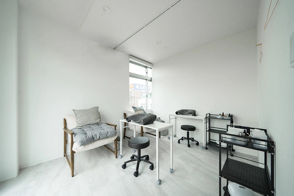 ブースのうち2室は、ハンドネイルとフットネイルの同時施術が可能な専用空間。施術効率を高めるだけでなく、お客様とスタッフ双方にとっての快適な動線も意識しています。フットネイルには専用の段差を設け、ハンドネイル用には折りたたみ式の什器をオーダー製作。限られたスペースの中でも、使いやすさと可変性を兼ね備えたブースに仕上げました。