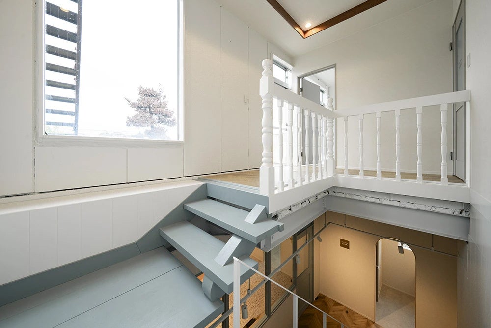 2階のネイルサロンは施主様が思い描いた「ゴールド×水色」で世界観を表現しました。