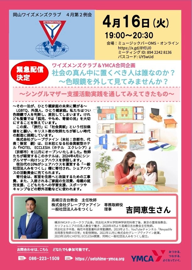 岡山ワイズメンズクラブとYMCAせとうちは、心温まる社会を築くための第一歩として、特別なオンライン講演会を開催します。この講演会では、牧師であり社会活動家の吉岡恵生氏が、京都の二条城駅近くで始めた「ホテルエクレシア」とシェアハウスによる画期的な支援活動について語ります。このプロジェクトは、ひとり親家庭への経済的支援と社会的包摂を目指し、ホテルの収益の一部をシェアハウス運営資金に充てています。