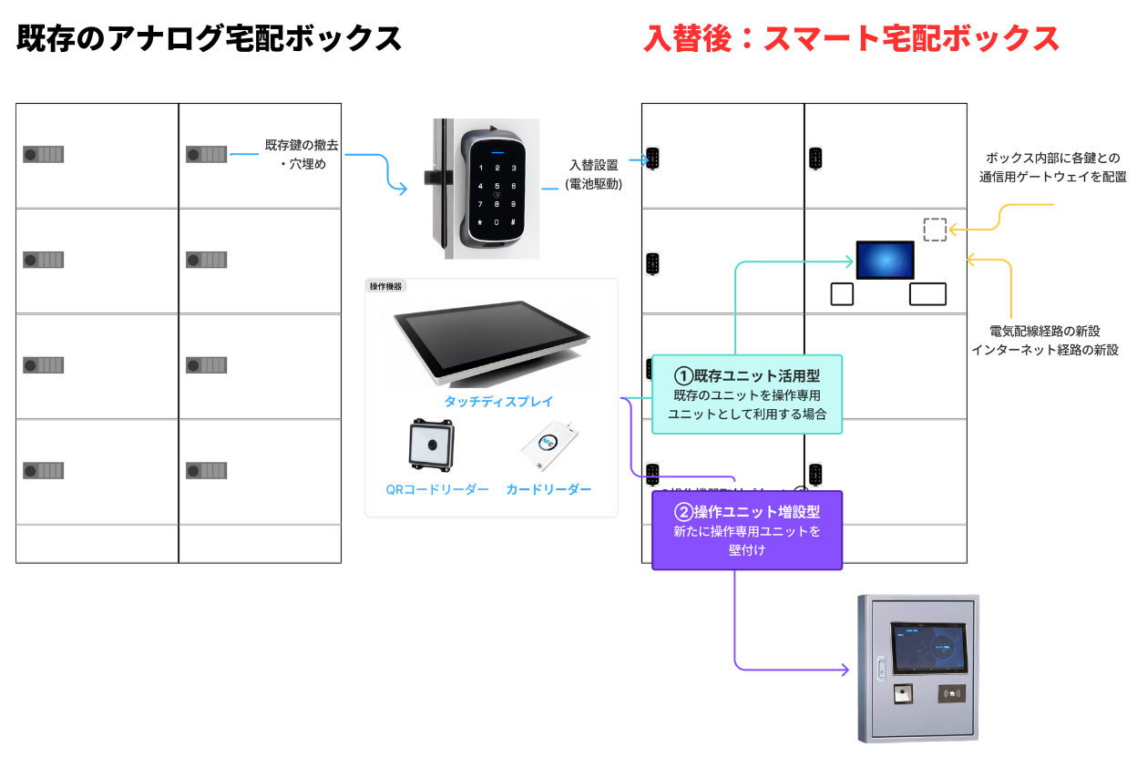 既存ユニット活用型:既存宅配ボックスの一部(1ユニット)を操作専用ユニットとして転換し、タブレット端末・QRコードリーダー・カードリーダーを組み込みます。