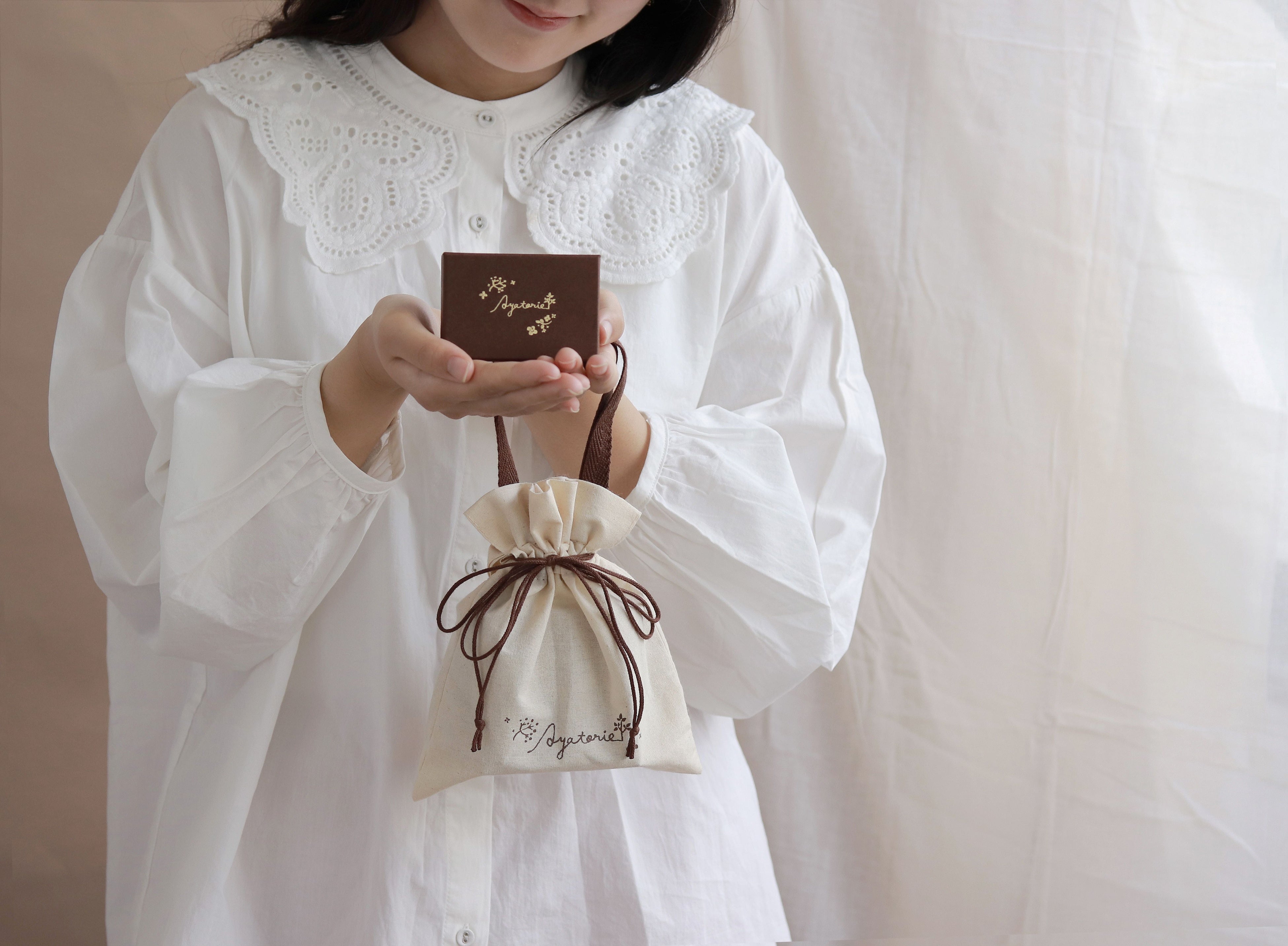 Ayatorieの商品には全てオリジナルボックスと巾着バッグが付いています。