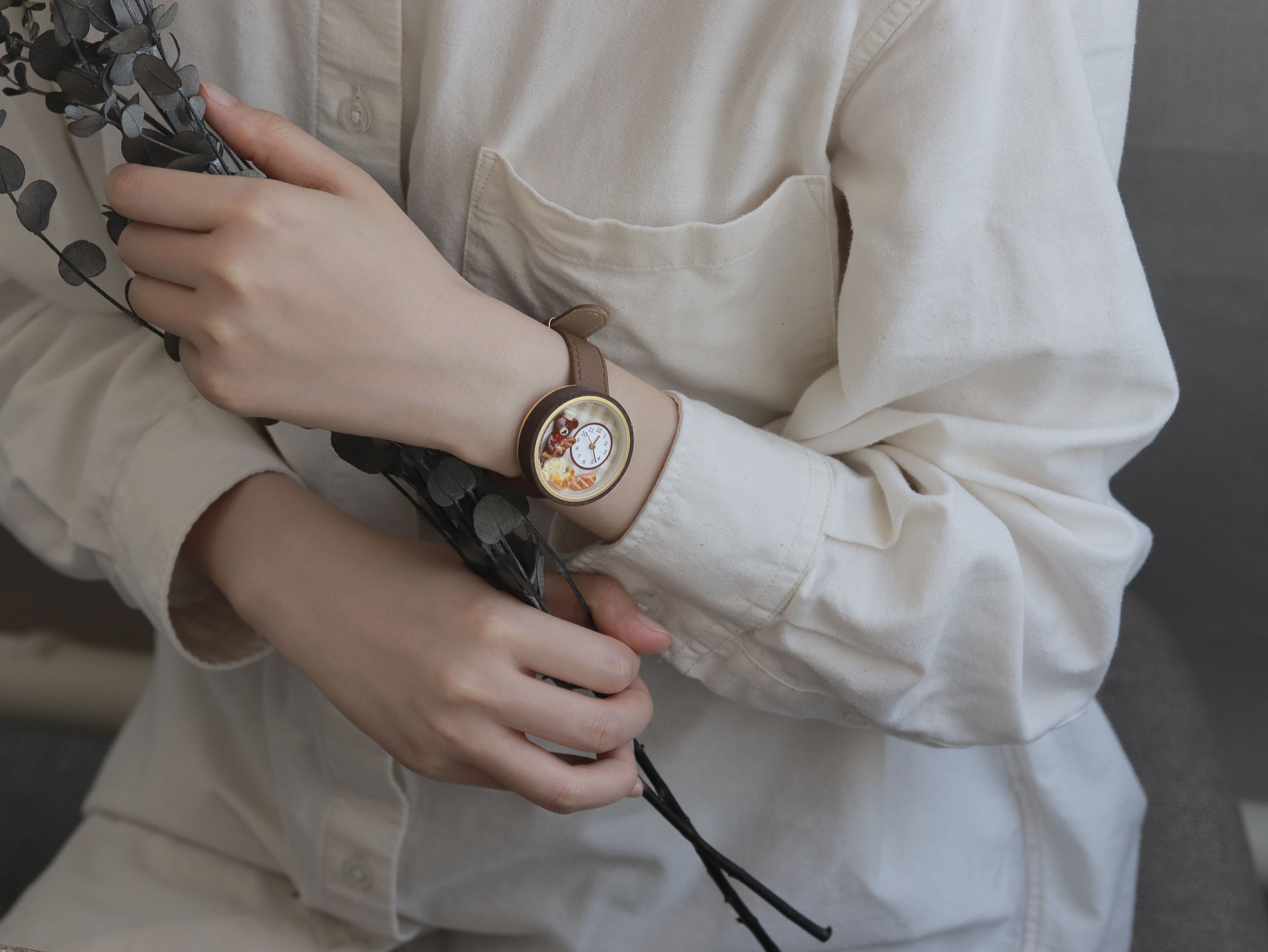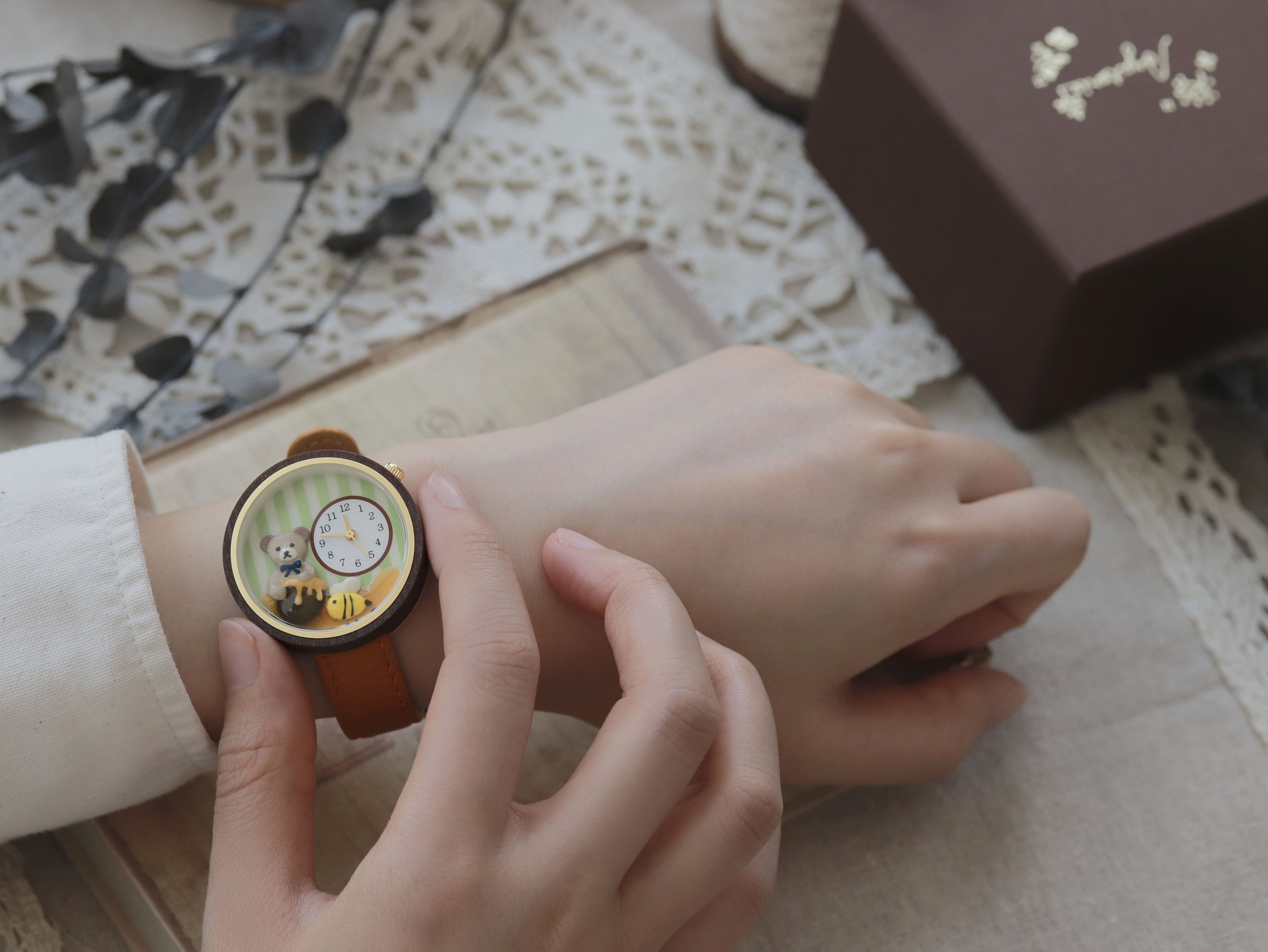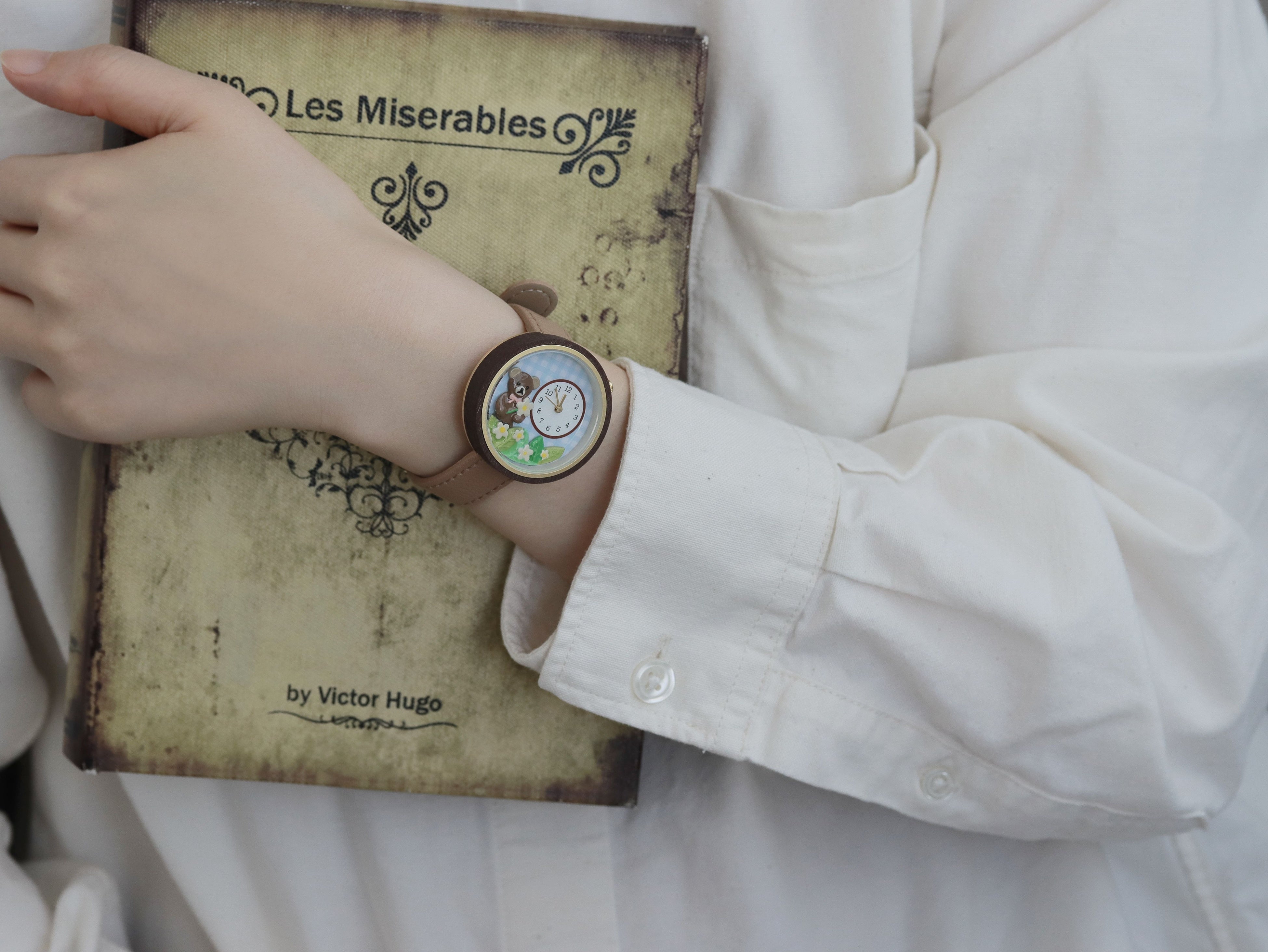 実用的かつ愛らしい物語が詰まった腕時計は、手元を飾るアクセサリーとしてだけでなく、テディベアとともに毎日の時間を彩ることができます。ベルトはどなたでも付けやすい、落ち着いたブラウンカラーで揃えました。