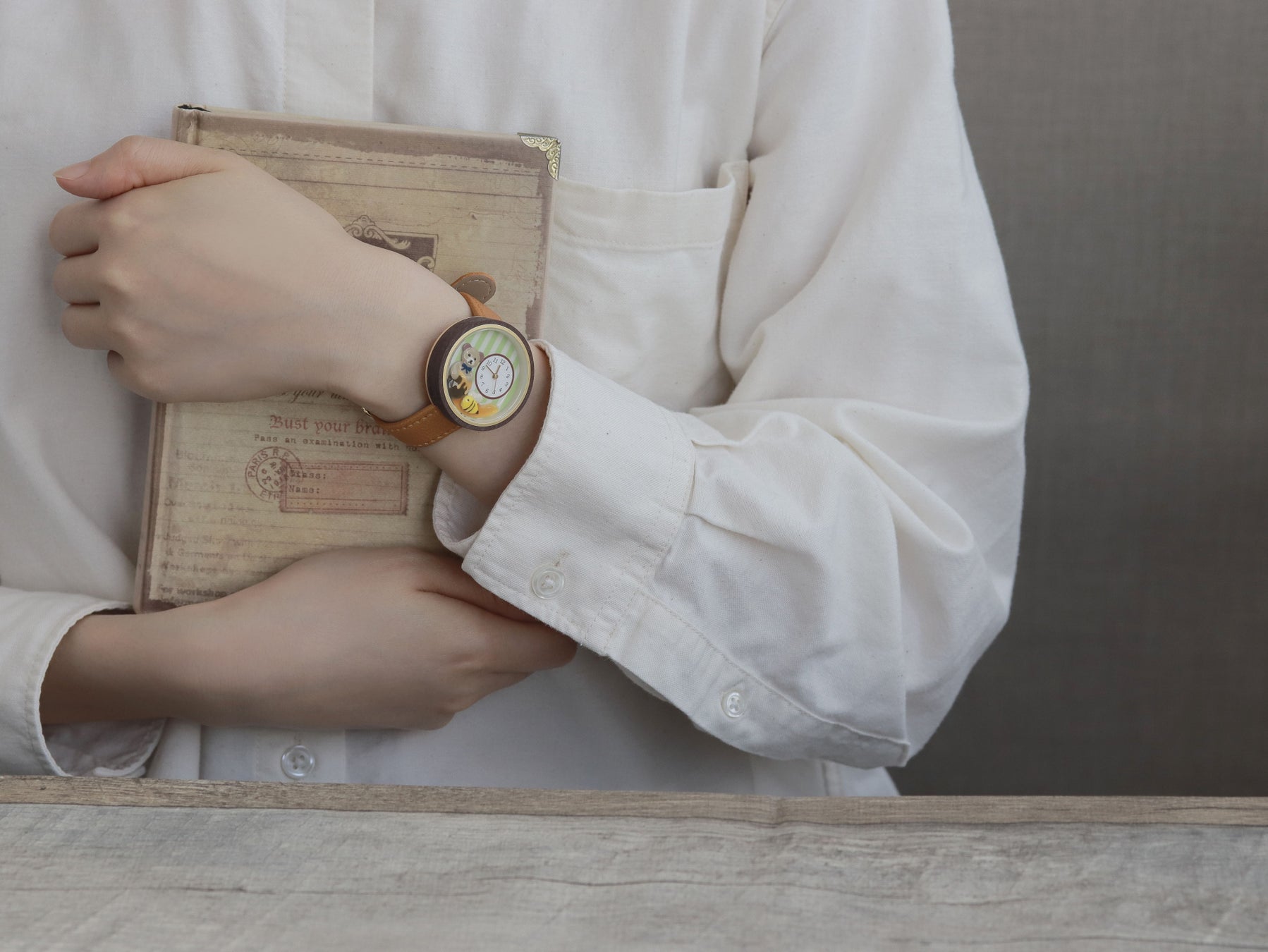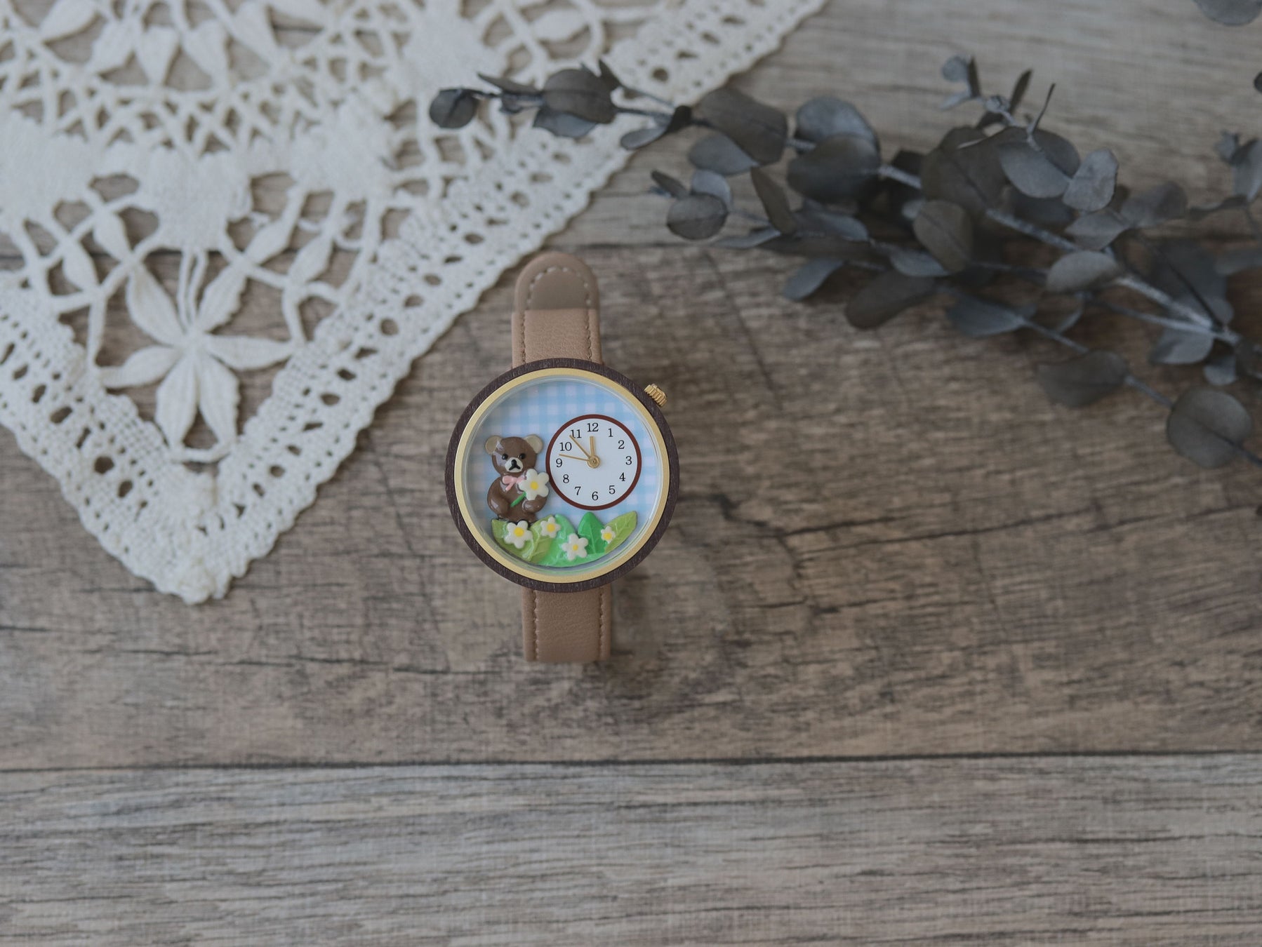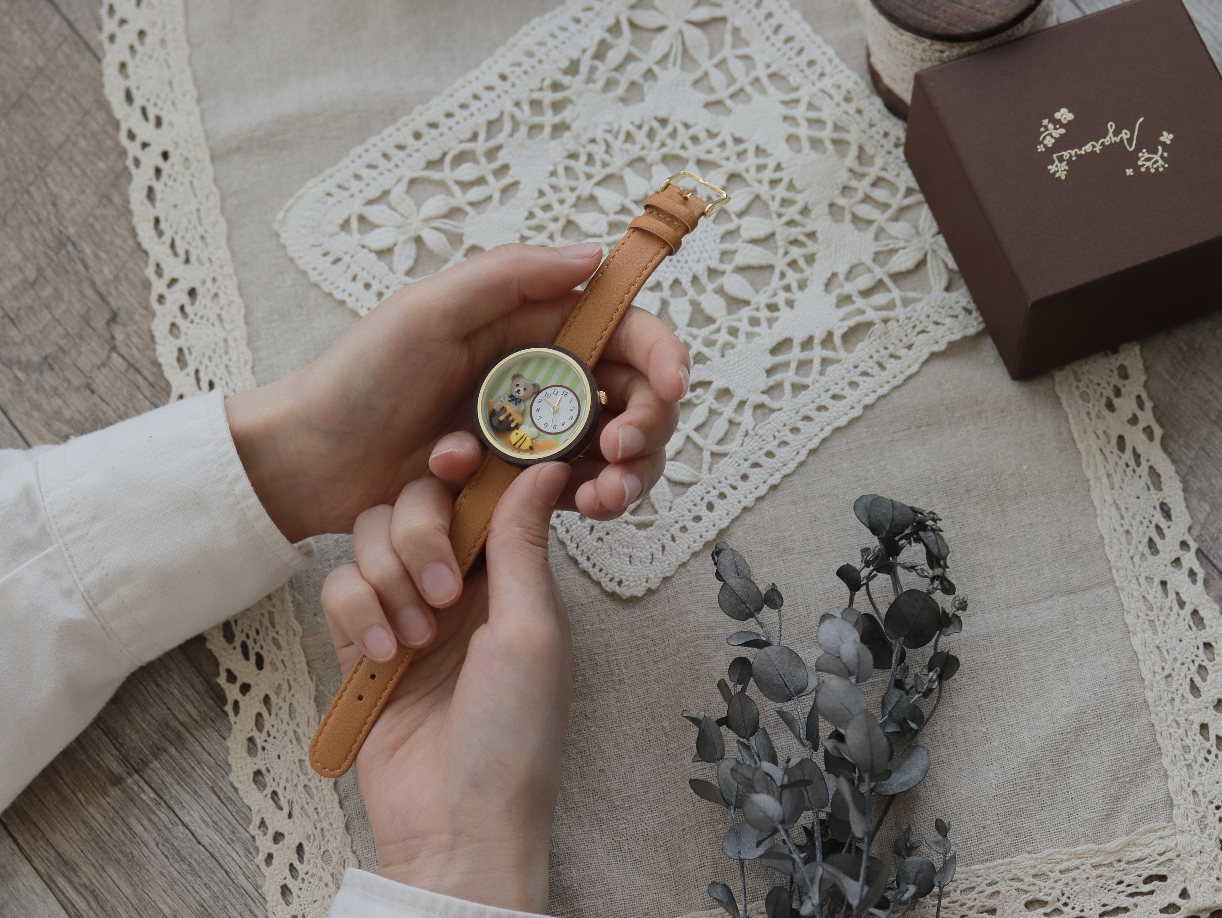 実用的かつ愛らしい物語が詰まった腕時計は、手元を飾るアクセサリーとしてだけでなく、テディベアとともに毎日の時間を彩ることができます。ベルトはどなたでも付けやすい、落ち着いたブラウンカラーで揃えました。