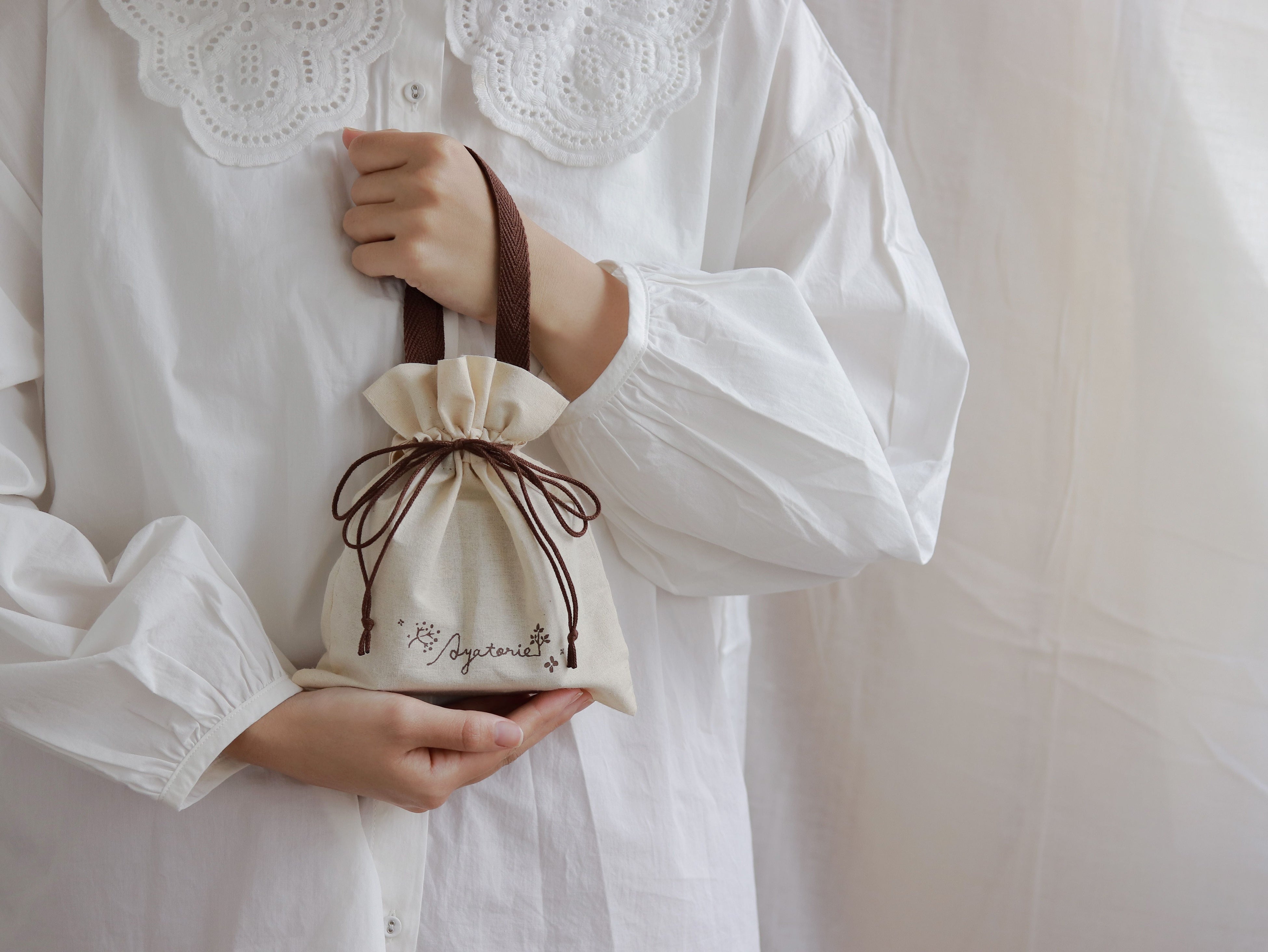 巾着バッグは、ちょっとした外出先での普段使いはもちろん、そのまま贈り物としても活用出来る、便利な持ち手付きです。