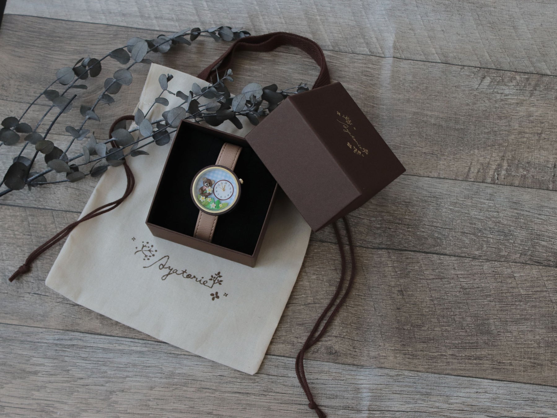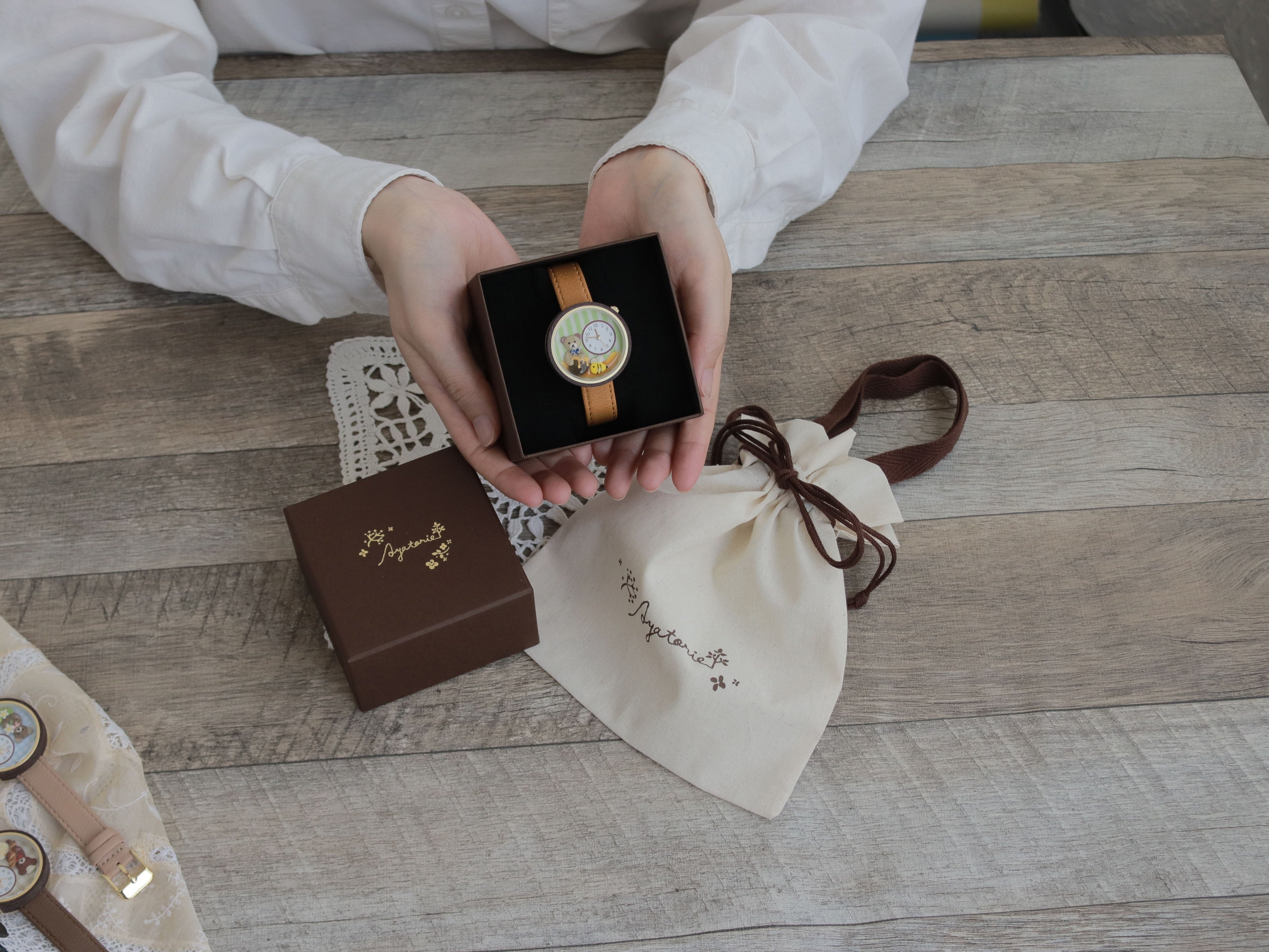 Ayatorie初の雑貨は、ブランドの代表モチーフでもあるテディベアを腕時計にし、世界観をあらわしました。