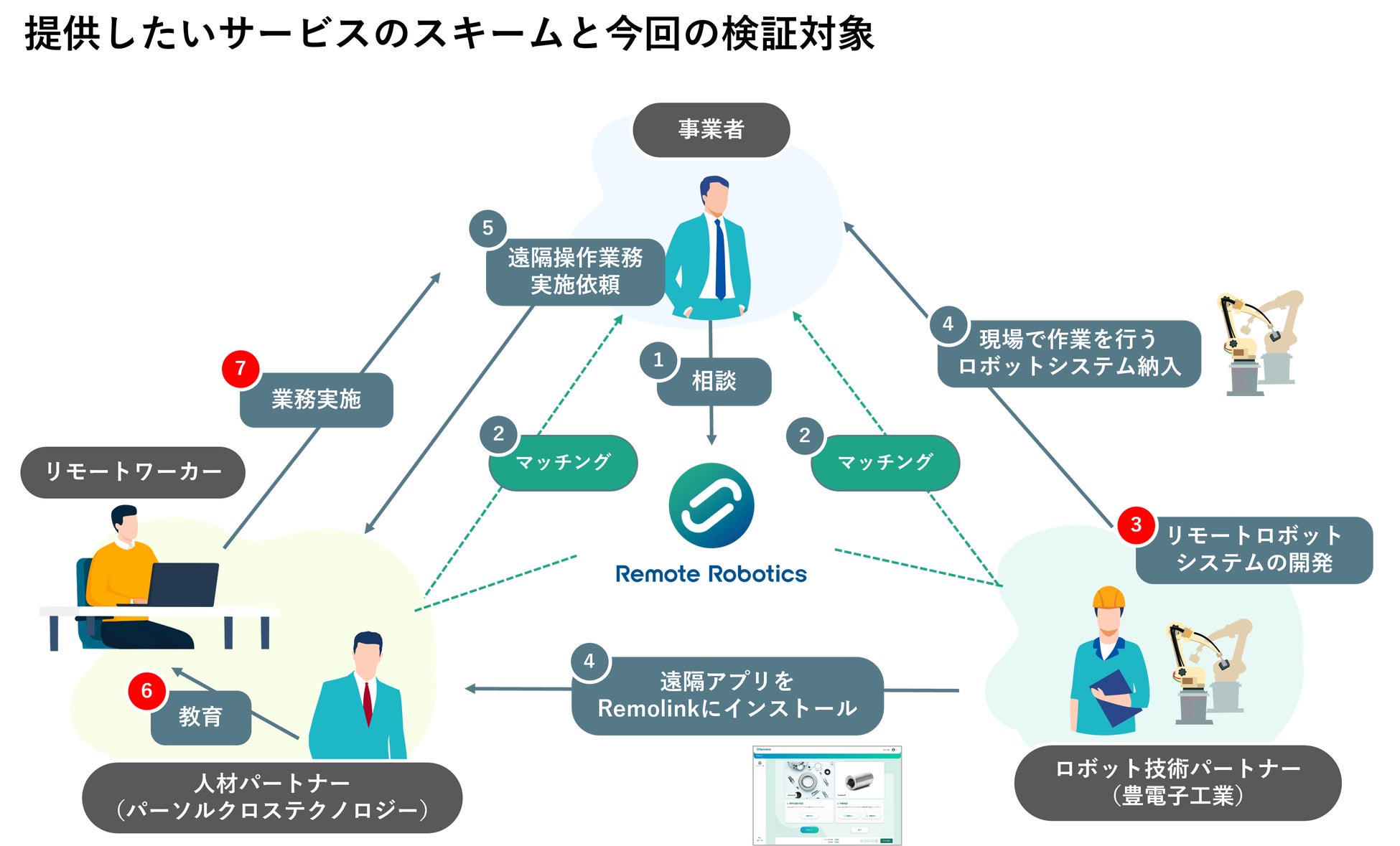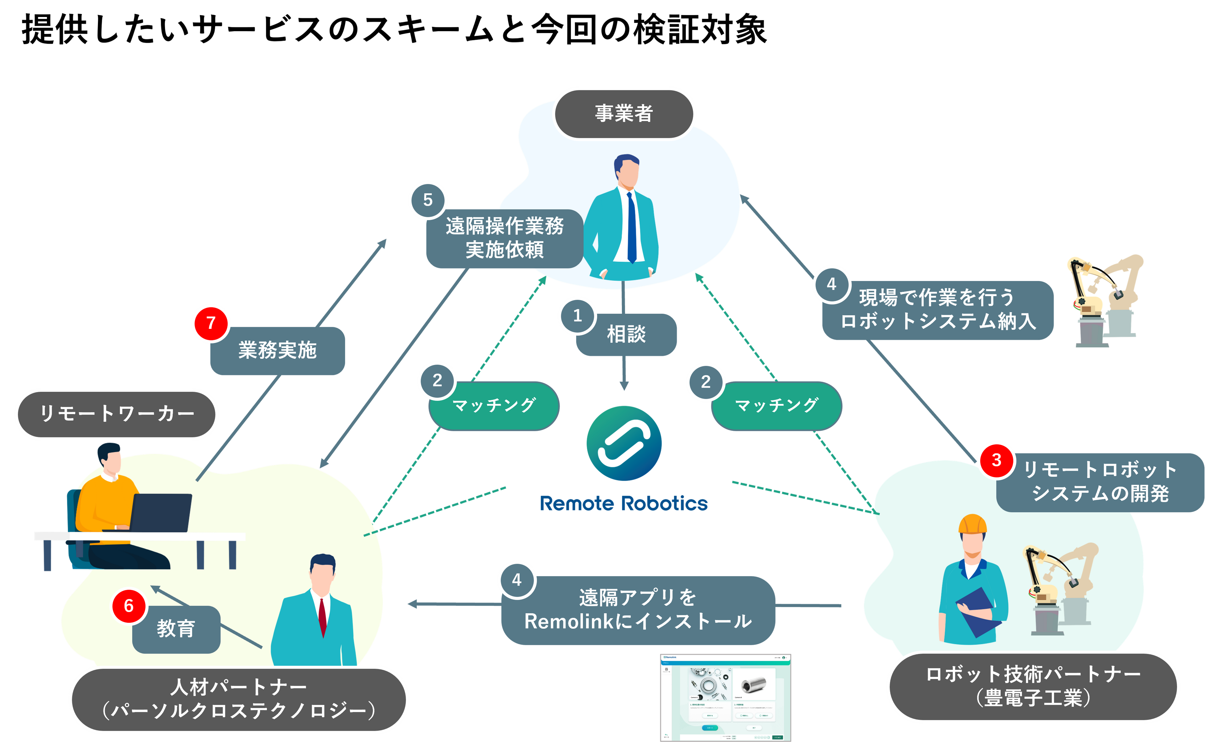 リモートロボットシステムを導入した事業者から、人材パートナーとしてパーソルクロステクノロジーがロボットの遠隔操作業務の実施依頼を受けたと仮定します。今回は、同社所属のリモートワーカーへの教育(図内⑥)、受託した業務を遂行する(図内⑦)と仮定し、ユーザーエクスペリエンス検証を行いました。
