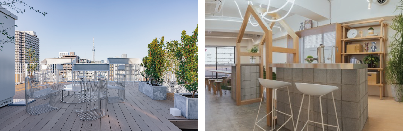 築年数に伴う修繕を実施したほか、屋上は、キュービクルを移設しテラス化し、共用空間となるラウンジ空間をセットアップフロアに。執務室フロアは企業のアイデンティティを自由に表現できるフレキブルさを残した1棟ビルへと生まれ変わりました。アイデアやカルチャーを生み出す企業へ向け、「場」をつくることで「コト」が生まれるようなバリューアップを図っております。