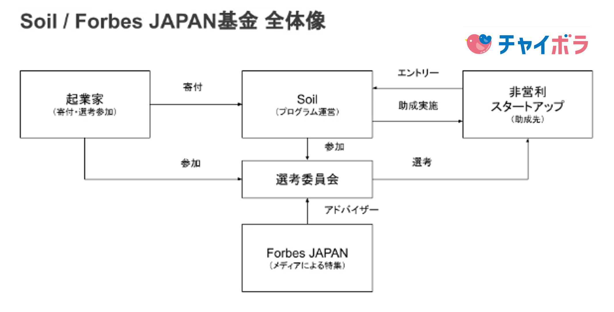 特定非営利活動法人チャイボラ(所在:東京都豊島区、代表理事:大山 遥、以下「チャイボラ」)は、「儲からない」けど「意義がある」非営利スタートアップを支援するインキュベーター・アクセラレーターの一般財団法人Soil(住所:東京都渋谷区、代表理事:久田 哲史、以下「Soil」)と、Forbes JAPANを運営するリンクタイズ株式会社との共同企画「Soil / Forbes JAPAN基金」の助成事業(以下、本事業)に採択されました。本事業は、優れた実績・アイデアを持つ非営利スタートアップに対しての資金助成、起業家からのアドバイスのほか、Forbes JAPAN誌面でもご紹介いただけるというプログラムです。