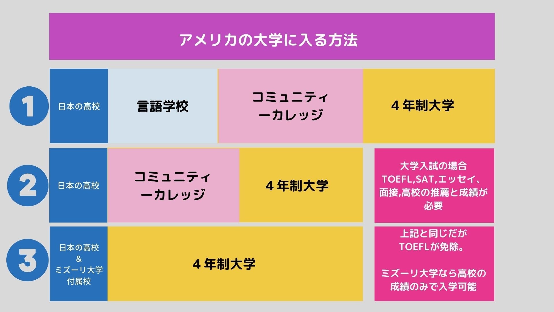 ➂TOEFL免除で、4年制大学に直接入る方法。特にミズーリ州立大学に入学する場合は、成績のみで入学可能。