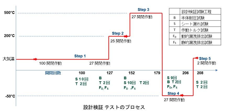 設計検証テストでは、第三者機関立会いの下、Shell DVTに準拠して単一の弁を使用して-50℃から500℃の全温度範囲の熱サイクル下で200開閉を超える作動を行い、各ステップでの漏れ試験に合格しています。