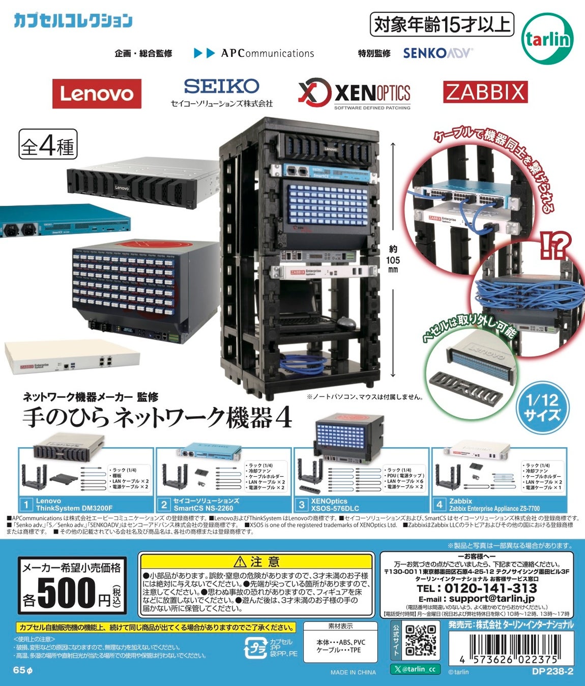 株式会社ターリン・インターナショナル(本社:東京都墨田区、代表取締役社長:佐藤直志、以下 ターリン)は、メーカー監修のもとITインフラ機器をミニチュア化した「手のひらネットワーク機器」の第4弾を、6月中旬より随時、全国のカプセルトイ自販機コーナーにて発売いたします。企画・総合監修は株式会社エーピーコミュニケーションズ(本社:東京都千代田区、代表取締役社長:内田武志、以下 エーピーコミュニケーションズ)が担当し、セイコーソリューションズ株式会社(本社:千葉県千葉市、代表取締役社長:関根 淳、以下 セイコーソリューションズ)、Zabbix Japan LLC (本社:東京都港区、代表: 寺島 広大、以下 Zabbix Japan)、レノボ・エンタープライズ・ソリューションズ合同会社(本社:東京都千代田区、代表取締役社長 張 磊、以下 レノボ)、XENOptics Holdings Pty Ltd(本社:オーストラリア メルボルン、CEO and Co-founder:Dragan Dimitrovici、以下 XENOptics)、センコーアドバンス株式会社(本社:三重県四日市、代表取締役社長:大倉 良介、以下 センコーアドバンス)が監修しました。