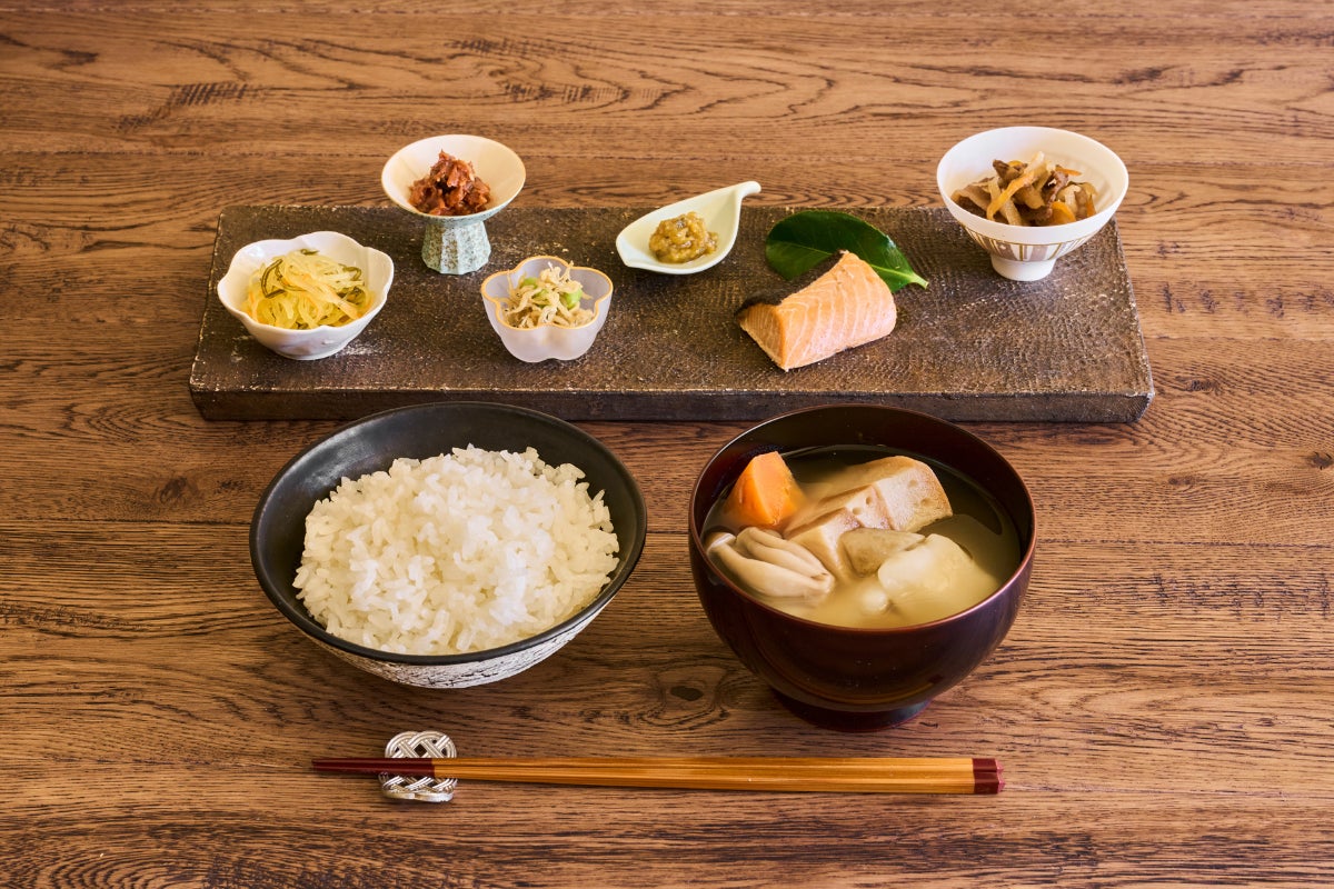 米粉のすいとん汁:新潟県産の米粉を使用し、もちもちとした食感に仕上げたすいとんと具材をだし汁に入れて煮込んだ料理です。根菜や車麩などの食材の食感と出汁の旨みを感じる、どこか昔懐かしいほっとする味わいです。