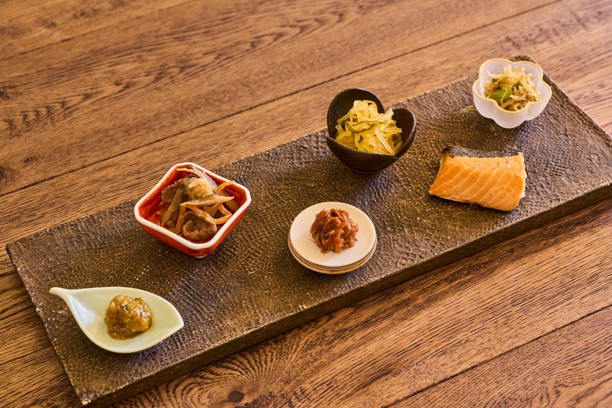(5) 梅かつお:新潟県内で栽培された「越の梅」の梅干しを、出汁とかつおと一緒に炒め煮した一品です。香り豊かで上質な梅干しの味わいをご堪能いただけます。