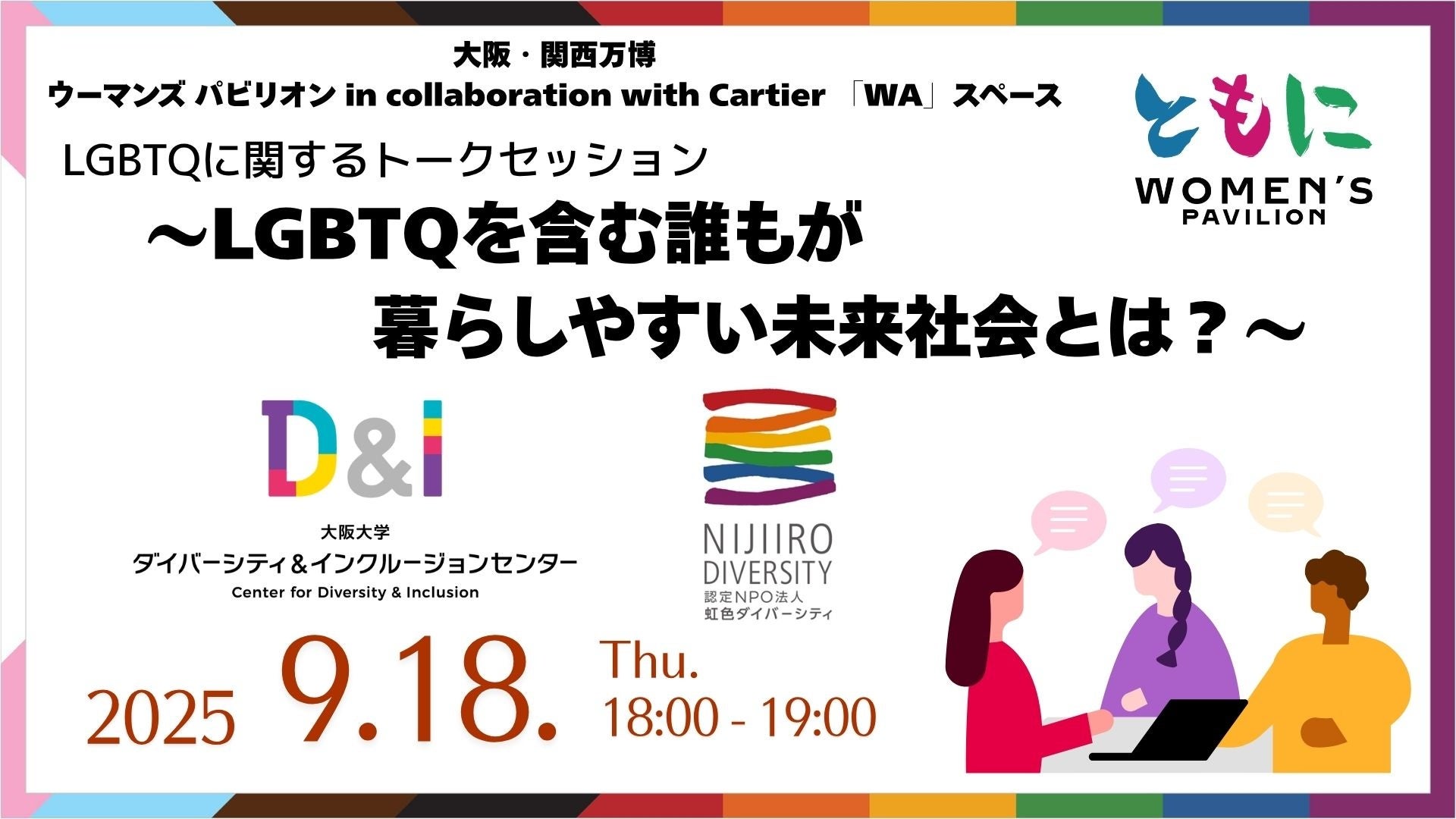 大阪大学ダイバーシティ&インクルージョンセンターと認定NPO法人虹色ダイバーシティ(所在地:大阪市北区、理事長:村木 真紀)は、9月18日(木)に大阪・関西万博 ウーマンズ パビリオン 「WA」スペースにて、LGBTQに関するトークセッションを協働で開催します。