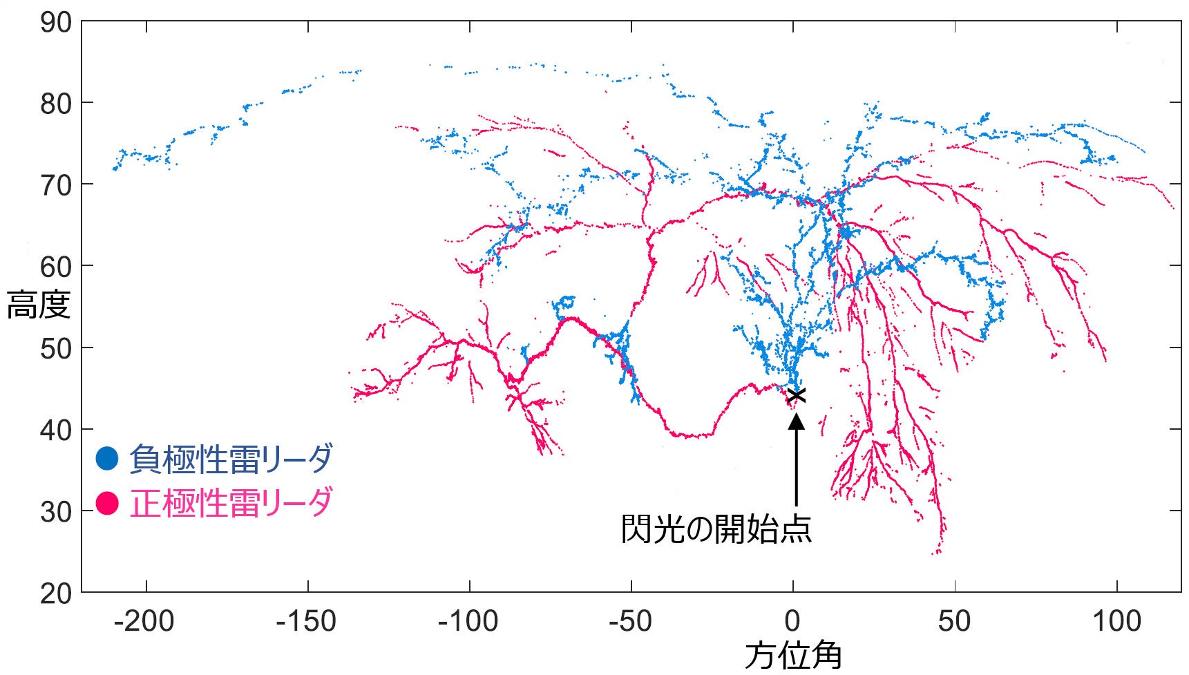 8基のアンテナを備えたこの8チャネルのシステムは移動が可能ですが、今までのところ、ダーラムにあるデューク大学校内に固定された状態で運用されています。2019年4月12日21:24:40UTCに、ここで解析された稲妻の閃光が記録されました。注目すべきは、この閃光全体が雷雲の中で発生しており、地上から見えたのは稲妻が反射して光る雲だけだった点です。しかし、VHF帯電波を計測することにより、右のダイアグラムが示すように稲妻の構造全体を捉えることに成功しました。方位角と高度をもとに、空中のあらゆるポジションが明確に示されています。下記リンクから、稲妻のタイミングシーケンスを表した動画を見ることができます。この動画は、1秒間の閃光をスローモーションで48秒に引き伸ばしたものです。画面に現れる点はそれぞれ、閃光から検出され位置が特定された異なる電波源を示しています。これらすべての点を一緒に表示したことで、稲妻発生時の空間と時間の構造が非常に鮮明に映し出されました。