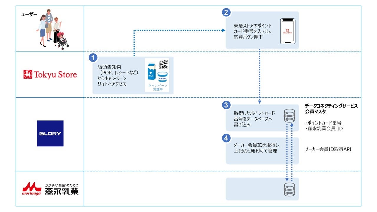 グローリー株式会社(代表取締役社長:原田 明浩、以下 グローリー)は、スーパーマーケットやドラッグストアなどの流通小売業の会員情報と、飲料や食料品、化粧品や日用品などさまざまなメーカー会員の情報を紐づけ、当該会員の店舗での購買データをメーカーに提供する「データコネクティングサービス」を、7月14日より森永乳業株式会社(代表取締役社長:大貫 陽一、以下 森永乳業)へ提供開始いたします。