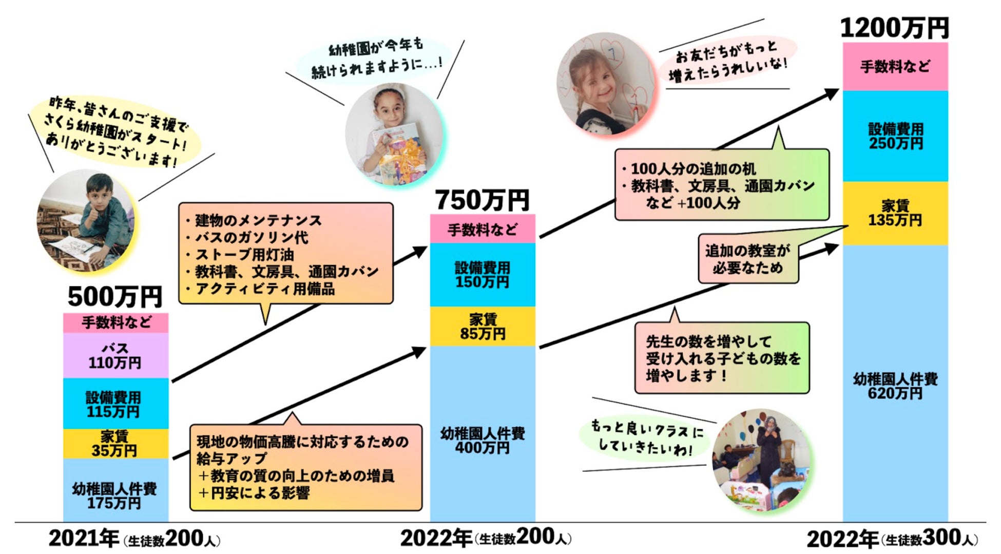 その後も資金を集めることができ、当初100名で予定していた生徒を200名に拡大し、通園バスの購入もすることができました。