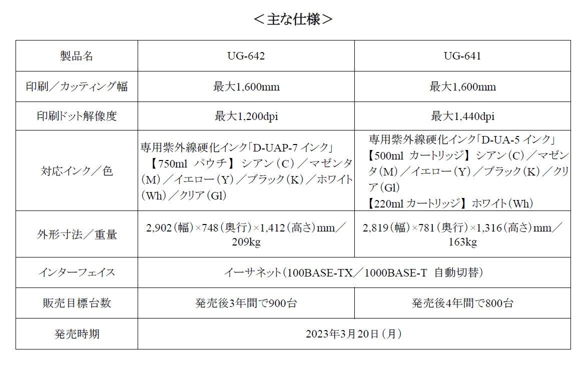 今回発表するUGシリーズは、サイン・グラフィックス市場やデジタルプリント市場で広がりを見せているUVインクを採用した大判インクジェットプリンターです。より生産性に優れたUG-642と、よりコストパフォーマンスに優れたUG-641の2機種をラインナップしました。UG-642はプリントヘッド2基をスタガ配列し、最速31.9m2/h (720×600dpi)の出力スピードを実現。大判の出力物を短納期で製作したい方や、出力ボリュームが大きなお客様に最適な一台です。そしてUG-641は、ビジネスの幅を広げたい方や、新しくプリントビジネスに参入される方が導入しやすい製品となっています。