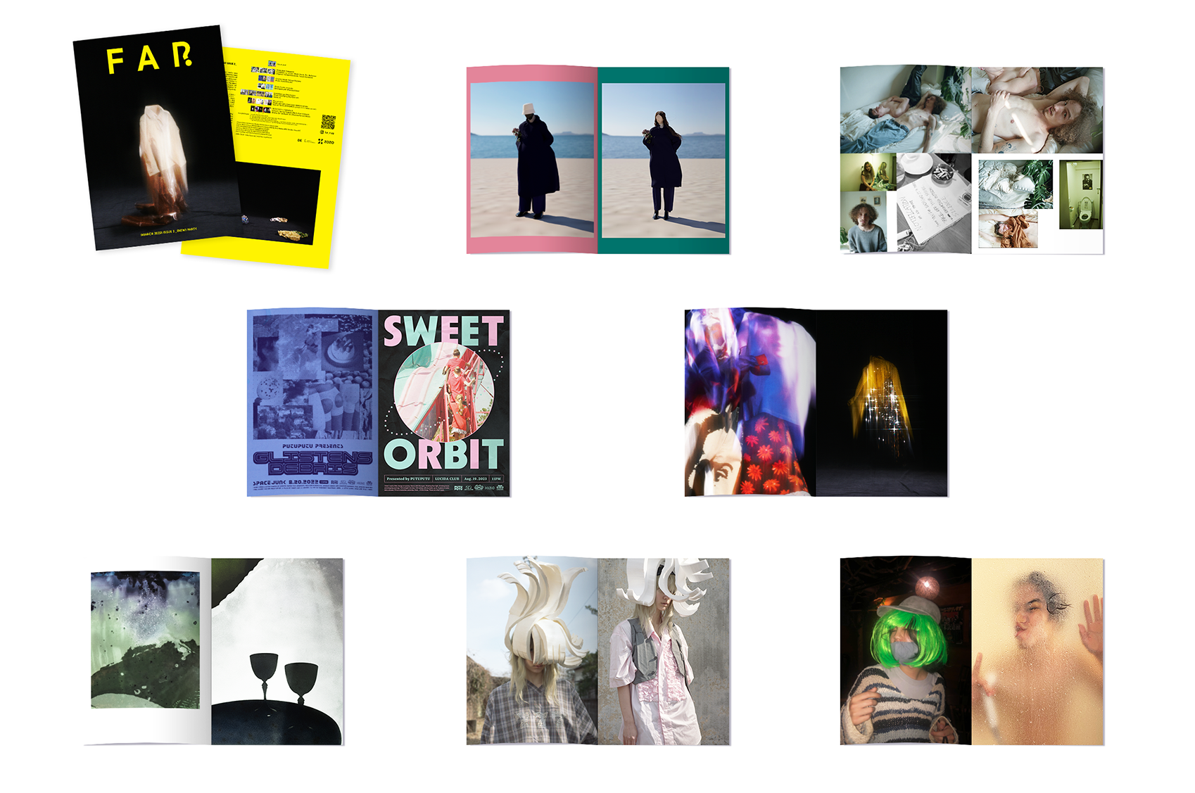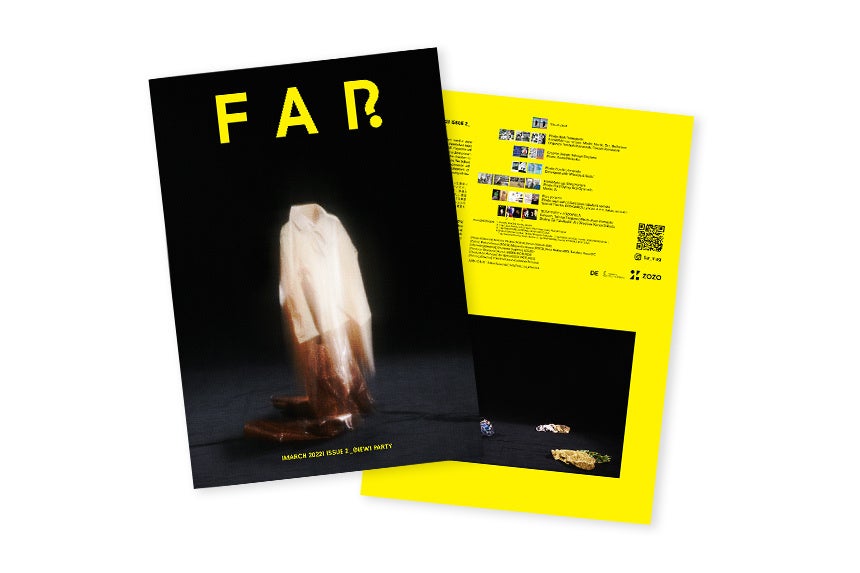 「FAR」は、各号のテーマのみを決め、多様な分野で活躍するクリエイター達に、自由に発想し表現してもらうことを目指して2021年6月に創刊した雑誌です。FARの編集チームは、雑誌の意図とテーマだけを伝え、7組のクリエイターがテーマをもとに自由に表現したビジュアルをそのまま掲載しています。“文字のない雑誌”として、各ページには作品名や作品の説明はもちろん、ページ番号の記載もありません。SNSで話題になった創刊号「FACE」に続き、第2号となる今回のテーマは「(NEW)PARTY」。クリエイターが「新しいパーティー」について考え、自由に表現したビジュアルをそのまま掲載しています。