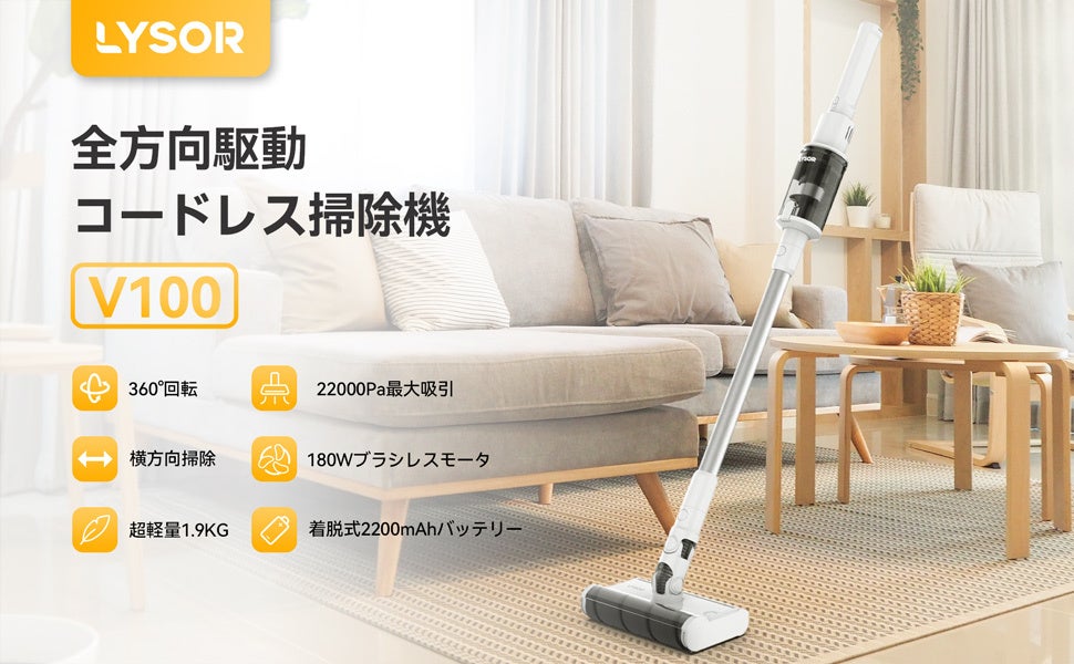 LYSOR V100 コードレス掃除機 全方向360°回転 強力吸引22KPA