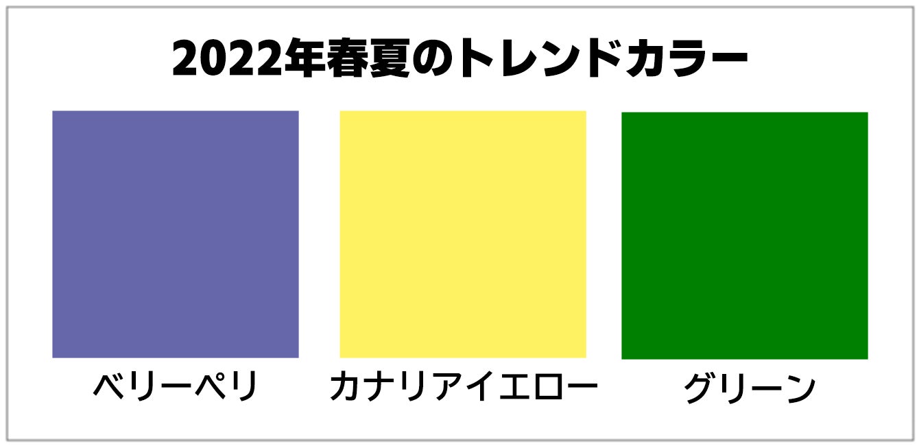 2022年春夏のトレンドカラーは、ベリーペリ(紫がかった淡いブルー)、カナリアイエロー、グリーンだといわれています。