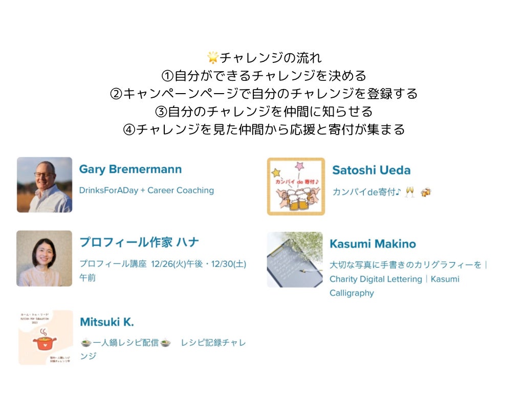 チャレンジャーになるということは、ご寄付を集めるファンドレイザーになるということです。自分の特技を活かしたワークショップの開催や、目標達成に向けた宣言にみんなから賛同を得るなど、チャレンジの方法はさまざま。
