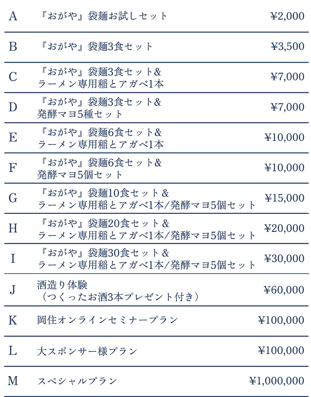 今回のクラウドファンディングでは、リターンの一部として「おがや袋麺」や、食品加工所「SANABURI FACRORY」で販売している動物性食材を一切使わずに製造した酒粕を使った「発酵マヨ」、「おがや」オープンにあたり開発したラーメン専用のクラフトサケを提供します。