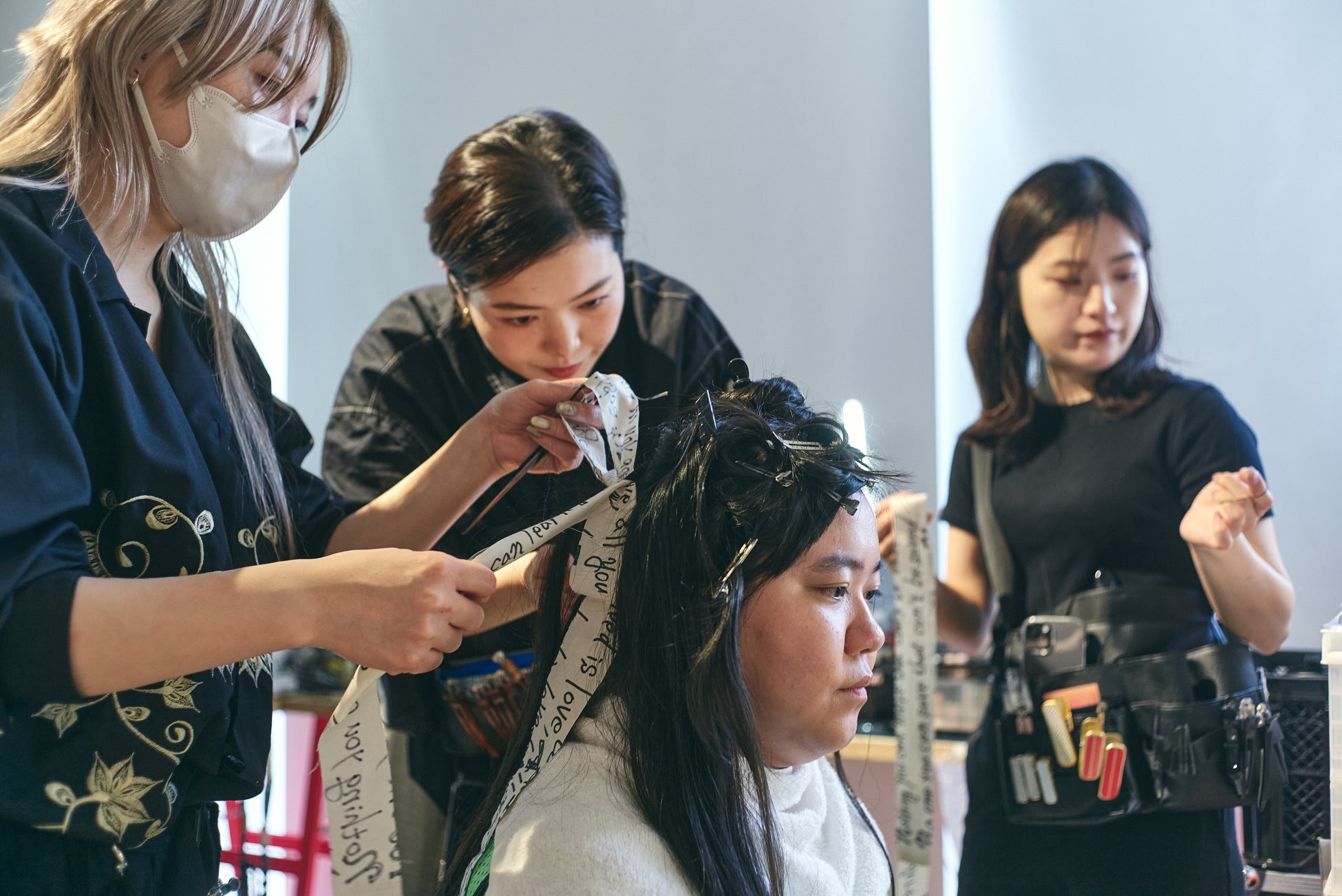 当日は朝から総勢40名のスタッフが準備を開始、音響・照明のプロチームの本格的な機材がはいり会場の雰囲気も盛り上がってきたところに、モデルメンバーのヘアメイクがスタート。へメイクアーティストハセガワヒロキ氏による衣装と同じモチーフの髪飾りを使ったヘアメイクが次々とでき上がり、楽屋の熱気も高まります。正午、全体リハーサル開始。モデル出演者の家族や、事業所の仲間・スタッフの応援、拍手の中、初の通しでのランウエイを披露し無事リハーサル終了。