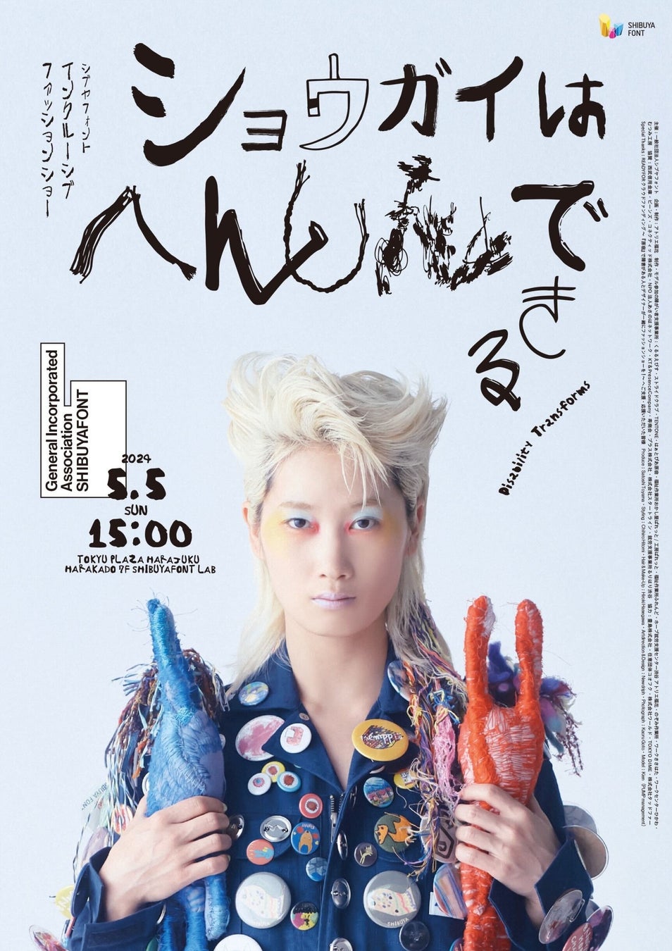 シブヤフォントの新たな拠点「シブヤフォントラボ」では、障がいのある人とそのコミュニティーが、今までにない新たな交流を生み出し、障がいのあるなしに関わらず、誰もが “へんしん” できる場所として運営し、これにより “障害” という固定観念を取り除き、多様な特性や解釈を受け入れる “ショウガイ” という新たなメッセージ「ショウガイはへんしんできる。」を発信していきます。そのメッセージを、シブヤフォントで活動する障がいのある人々がデザイナー、スタイリスト、映像クリエーターなど、様々な分野で活躍するプロのクリエーターとコラボレーションして創り上げるインクルーシブファッションショーとしてカタチにしました。