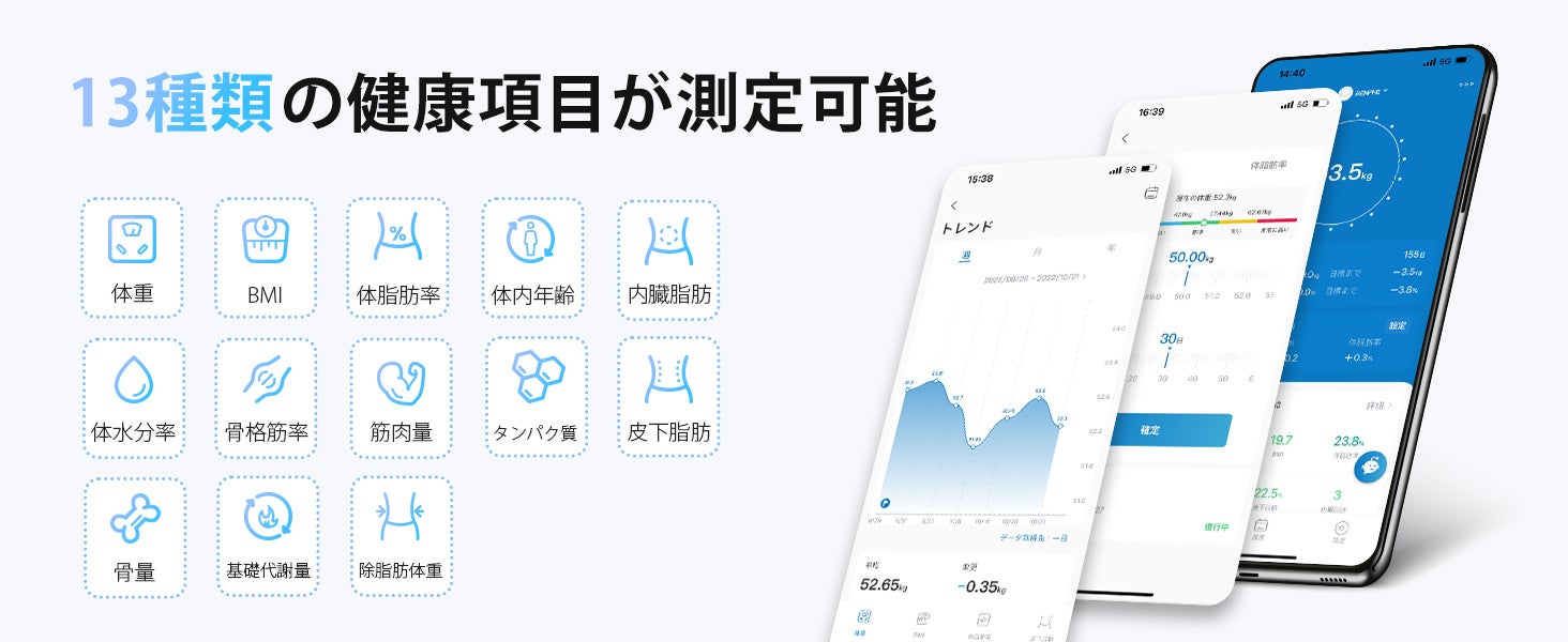 乗るだけで、体重/BMI/体脂肪率/皮下脂肪/内臓脂肪/体内水分率/骨格筋/筋肉量/推定骨量/タンパク質/基礎代謝/除脂肪体重/体年齢など13種類の健康項目がすばやく測定され、Bluetooth専用アプリでデータ自動転送&記録可能です。加えて、ユーザー登録数無制限、Samsung Health / Fitbit / Apple health / Google health と連動可能な体組成計です。