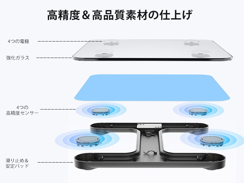 四つの高精度のセンサーで正確な体重測定が可能。BIA技術は、人体に微弱な電流を流しており、その電流が体を流れる際に発生する抵抗(インピーダンス)を測定し、各項目を算出します。