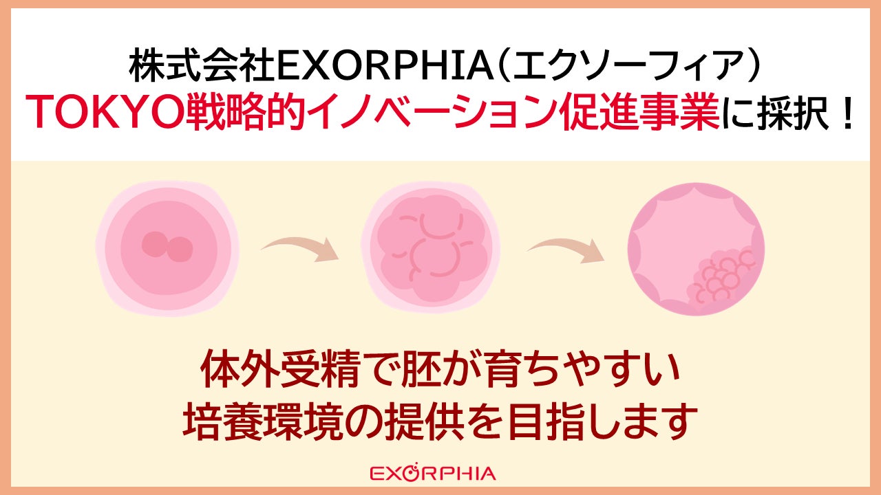 株式会社EXORPHIA(本社:東京都千代田区、代表取締役社長:口石 幸治)は、東京都等(※1)の「令和7年度 TOKYO戦略的イノベーション促進事業」に採択されました。本事業による上限8,000万円(※2)の助成を活用し、産学医連携による世界初の「体外受精用卵管上皮細胞由来EV添加剤」の開発・実用化を推進します。