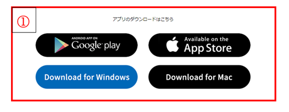 ①パソコンやスマートフォンから以下URL内にある「アプリのダウンロードはこちら」から、