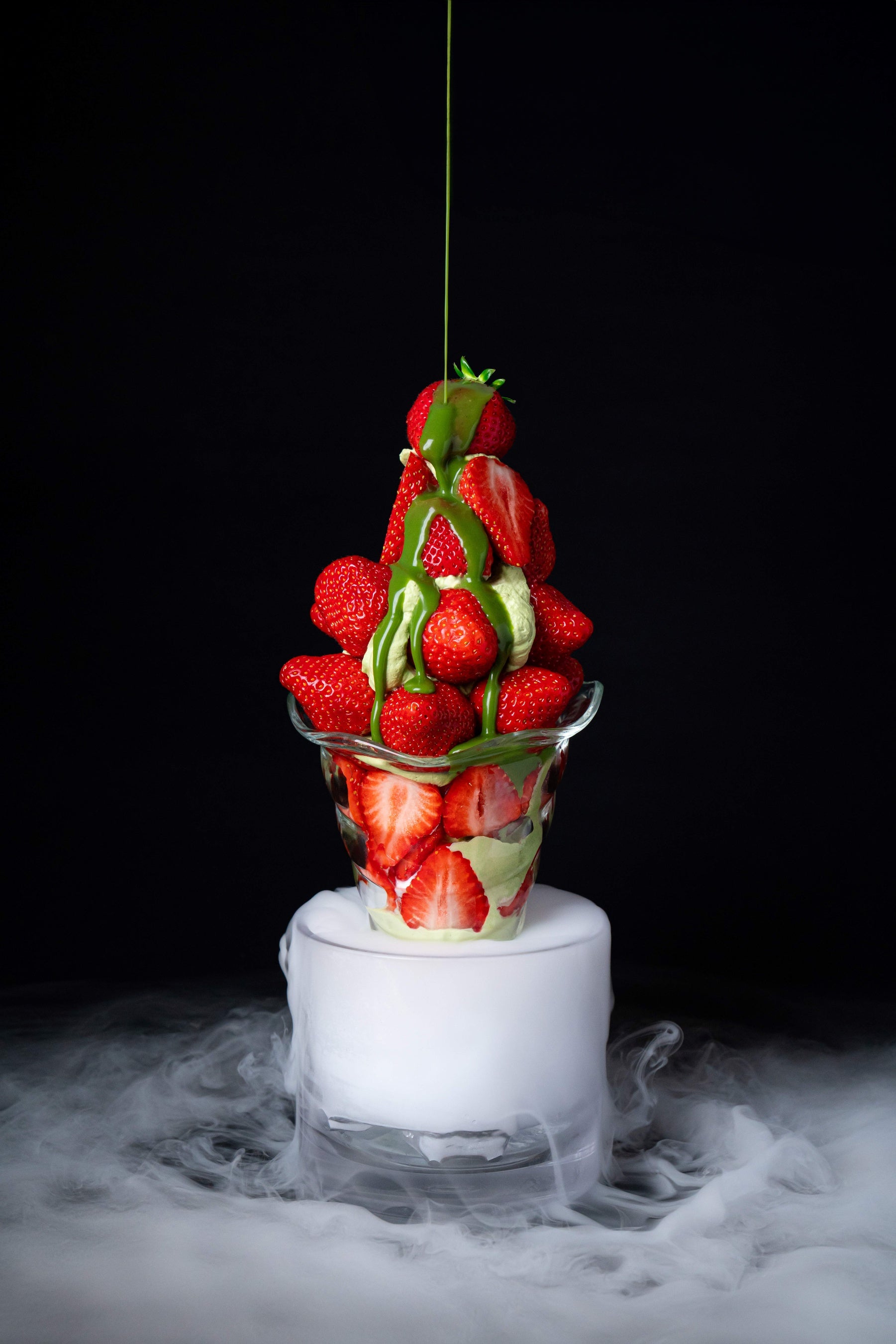 早朝のいちご畑に広がる朝靄をイメージし、京都自慢の宇治抹茶×福岡県産博多あまおうをふんだんに使用したspecialなパフェ。