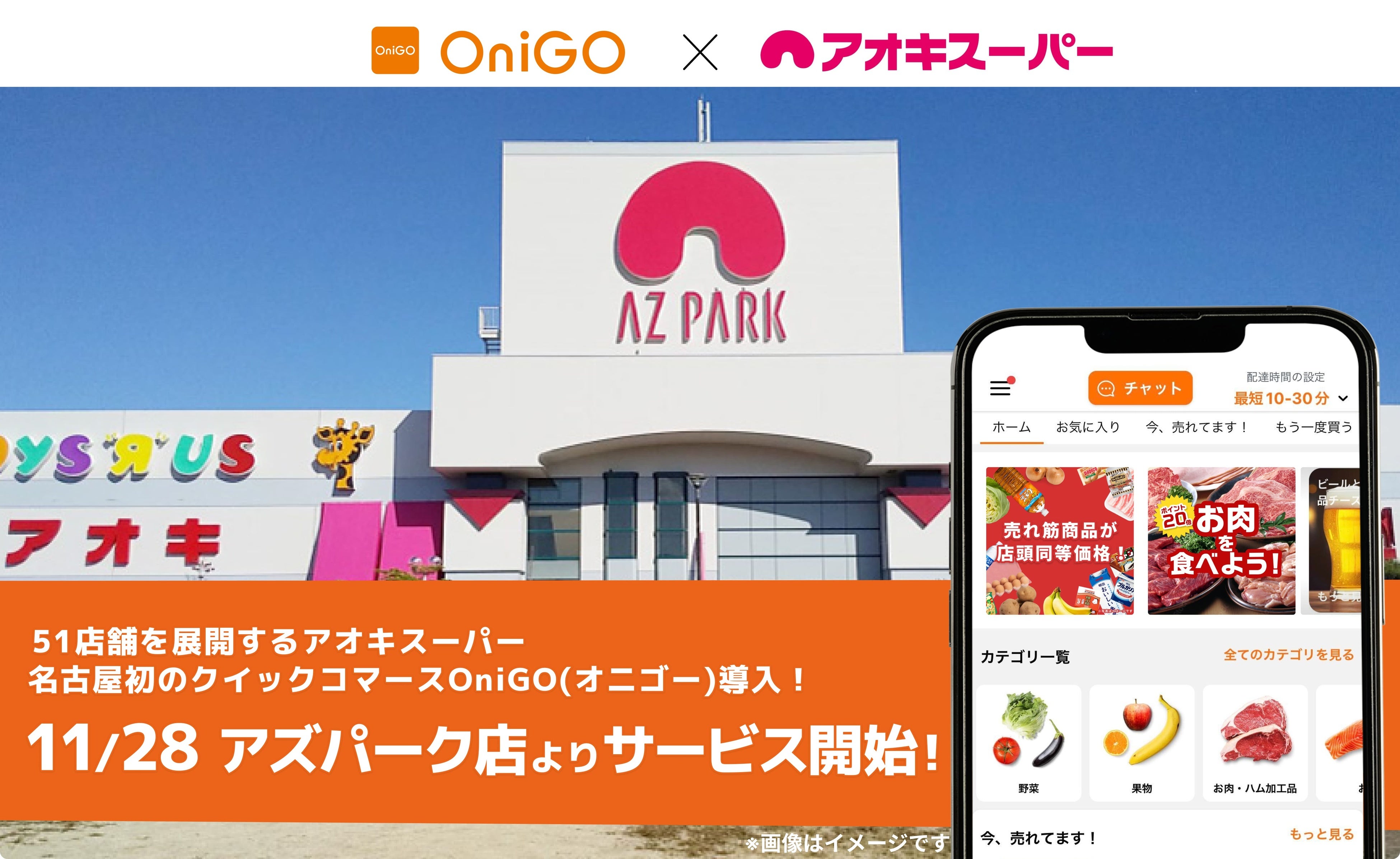 クイックコマースを牽引するOniGO株式会社(本社:東京都世田谷区、代表取締役:梅下直也、以下 「OniGO」)は、名古屋市を中心に地域密着型チェーンスーパーを運営する株式会社アオキスーパー(本社:愛知県名古屋市、代表取締役社長:青木俊道、以下「アオキスーパー」)と業務提携し、2023年11月28日、アオキスーパー アズパーク店(愛知県名古屋市中川区)よりクイックコマースサービスの提供を開始します。