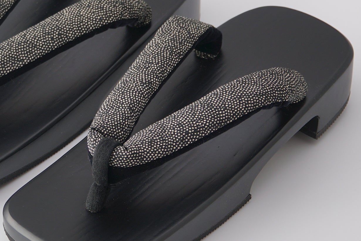 「男下駄‟マットブラック”」は、材料に非常に軽量で柔らかい「桐」を使用し、さらに下駄の表面に厚さ1mm程度の柾目の経木(桐の薄板)を貼った後、職人が1足1足丁寧に塗りあげた美しい仕上がりとなっています。