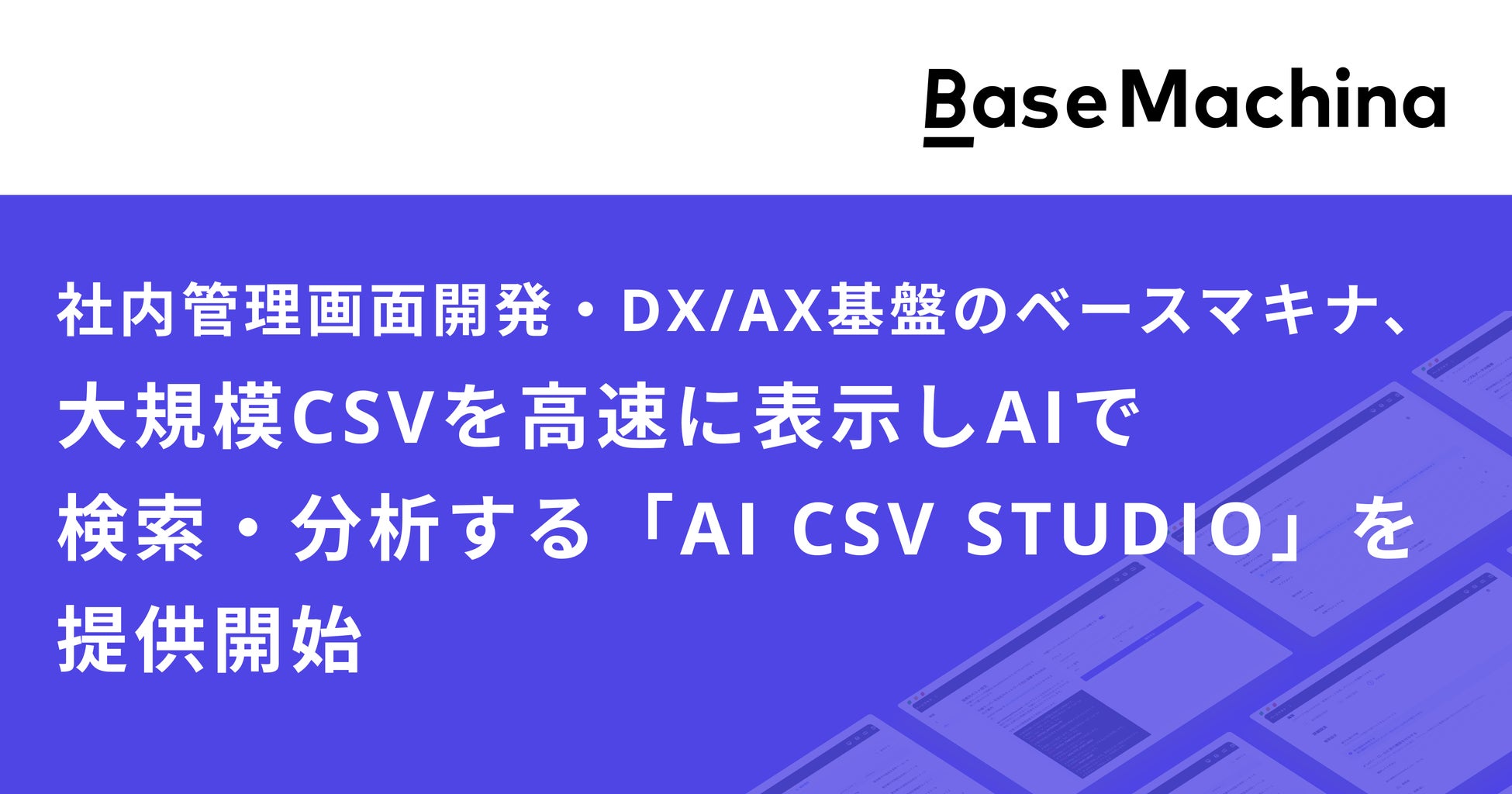 Web事業者様の社内管理画面をはじめとして、社内のERP補完・リプレイスなどにも使えるDX/AX基盤の「ベースマキナ」を提供する株式会社ベースマキナ(東京都中央区、代表取締役社長 髙橋誠二)は、「AI CSV STUDIO」の提供を開始いたしました。