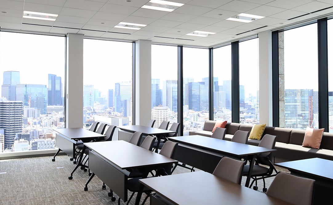 新オフィスでは、会議室の大半が窓側に面した開放的な空間になっています。壁を広く使用した継ぎ目がないホワイトボードはプレゼンテーションや社内活動に活用できます。