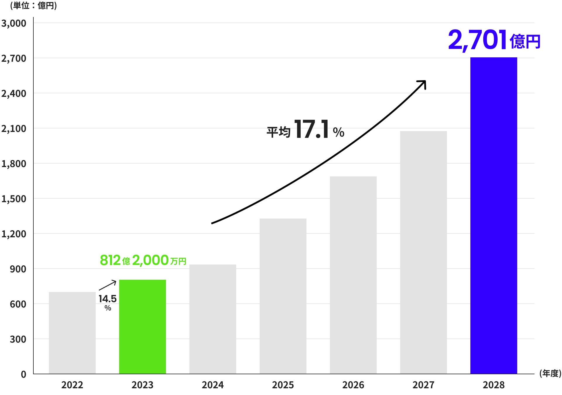 ITRの調査によると、2023年度の国内ノーコード/ローコード市場規模は812億2,000万円、前年比14.5%増と報告されており、今後も年平均成長率17.1%で拡大し、2028年には2,701億円に達する見込みです。