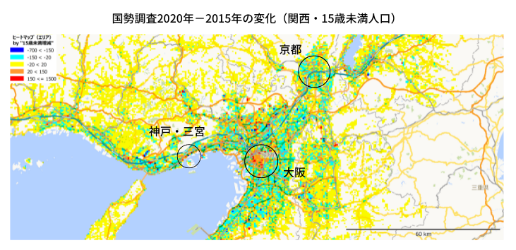神戸は三宮近辺のみ若年・労働力人口が増え老齢層が減少その周りでは逆の状態。