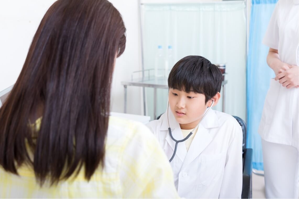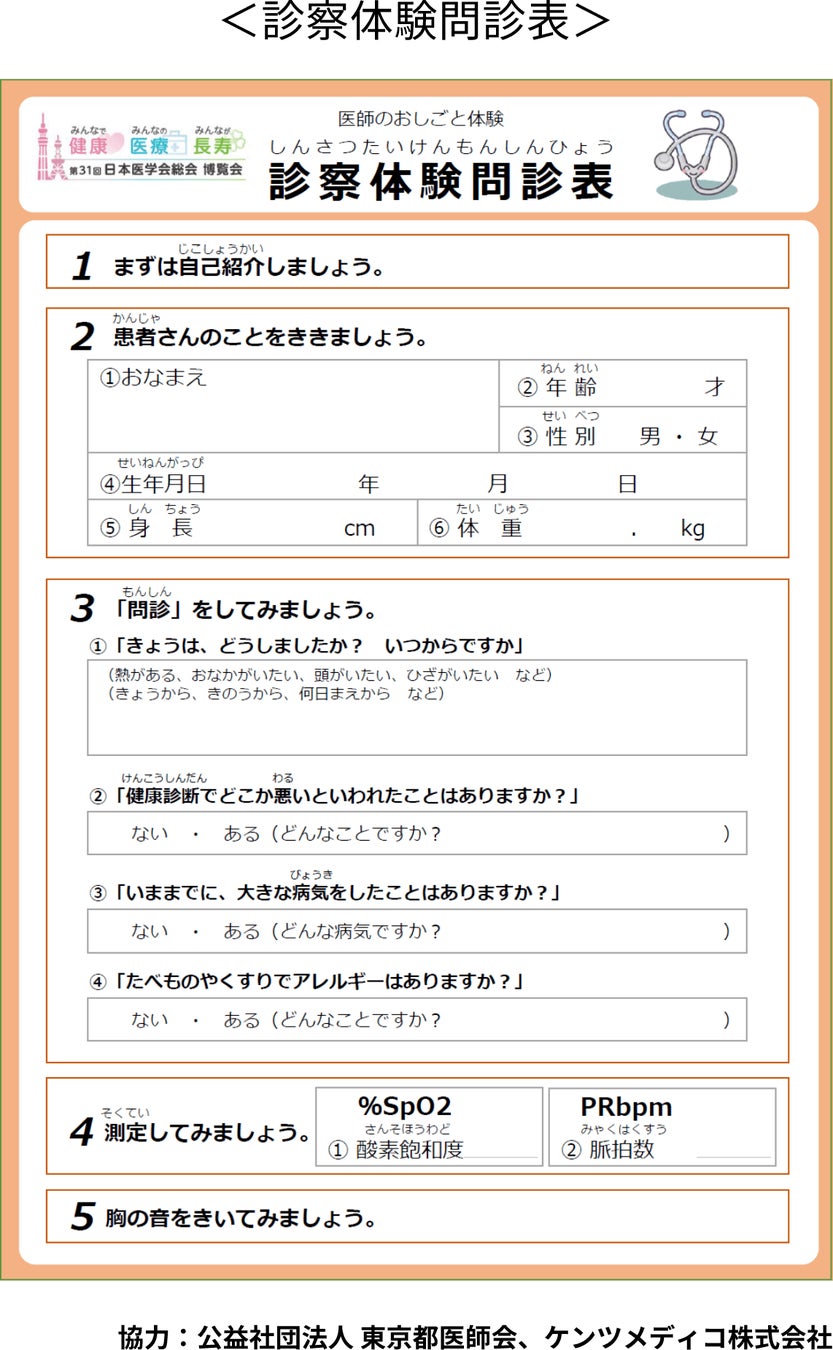 医師になりきって、診察体験問診表を見ながら、からだに関しての質問(問診)やからだの測定、胸の音をきく体験にチャレンジしてみよう。